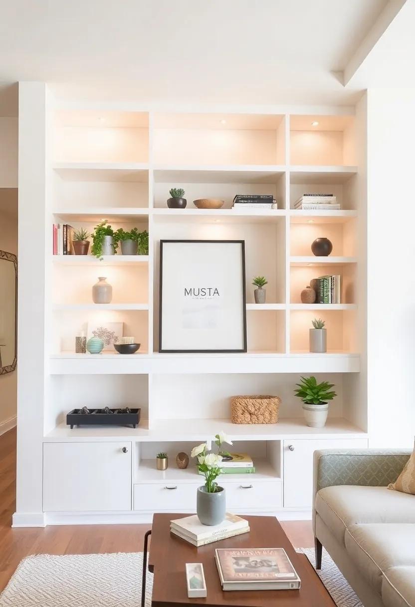 To further optimize your storage, think beyond traditional shelving and explore the potential of floating shelves. Installed at varying heights, these shelves can create visual interest while serving the purpose of efficient storage. For a cohesive look, paint the shelves in the same color as your wall to make them appear as if they are part of the architecture. Additionally, consider integrating hidden compartments or drawers beneath the shelves, allowing for discreet storage of smaller items without cluttering your space. You might even create a mini-library with a dedicated wall section, inviting both organization and style into your compact living room.