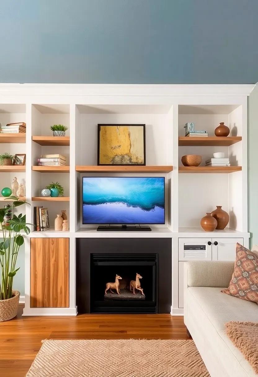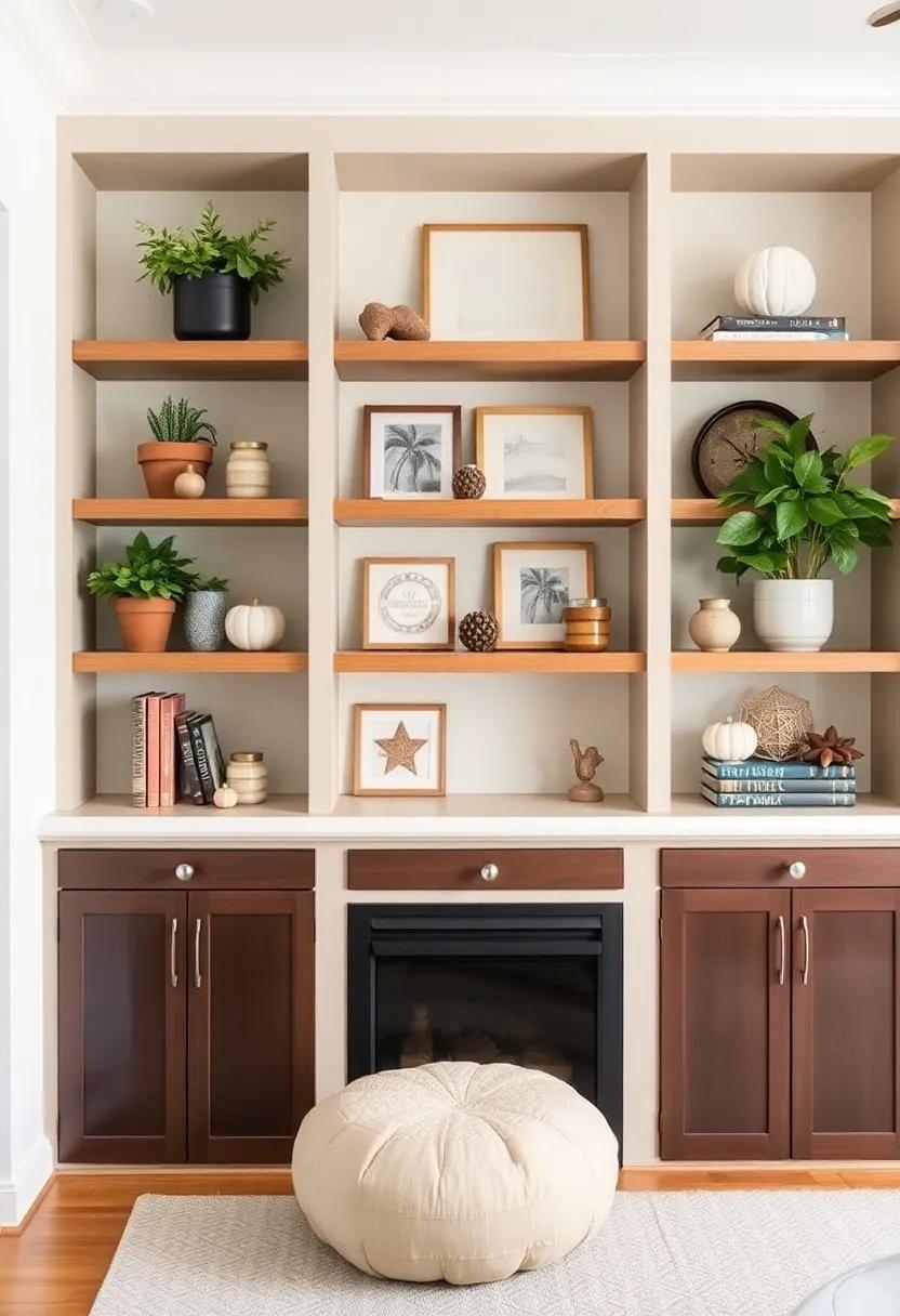 These themes can enhance the mood of your living space while effectively utilizing the often-overlooked real estate of built-in shelves. To further personalize your arrangements, don’t hesitate to integrate unexpected elements like: