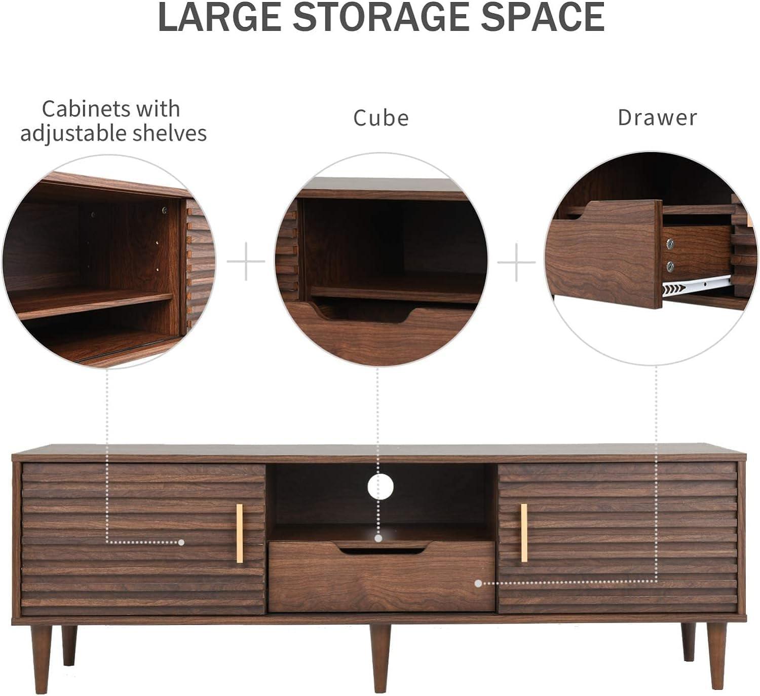 You notice the silhouette before the details: the unbranded 59-inch Mid-Century TV Stand sits low and long, it’s tapered wooden legs giving the piece a subtle lift from the floor. Up close the brown finish reads warm and slightly satin; the particleboard top is smooth under your palm, while the metal handles feel cool and precise when you reach for a drawer. Sliding the doors reveals a faint,utilitarian scrape along the tracks and an open center shelf that frames whatever electronics hum beneath the screen. It settles into the room with a calm, lived-in presence—measured, textured, and quietly utilitarian.