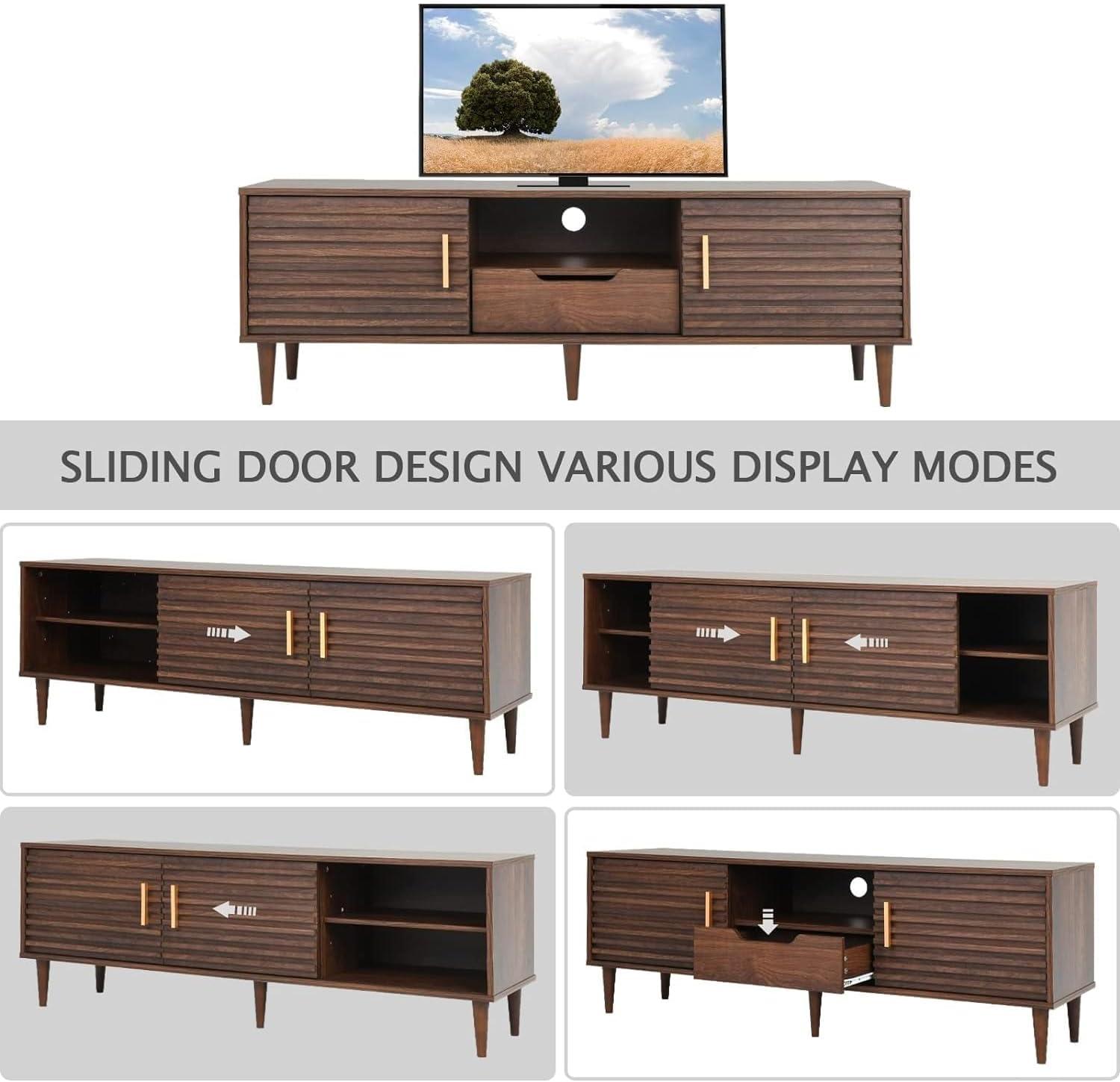 When you live with the Mid-Century Modern TV Stand for TVs up to 65″ Wood TV Console Media Cabinet with Drawer, Sliding Door Storage Cabinet, Open Shelf Home Entertainment Center for Living Room and Bedroom, Brown 59″, it doesn’t announce itself so much as it settles — the lines soften as you reach for remotes and the shelves gather the slow accretion of daily things. Over time you notice how its presence shapes small habits: where you set coffee while watching, how storage absorbs the clutter between guests, and how the top takes surface wear in thin, familiar marks from lamps and keys. In daily routines it simply becomes one of the quiet actors in the room, holding screens, books, chargers and the detritus of ordinary evenings, folding into regular household rhythms rather than calling attention to itself. It stays.