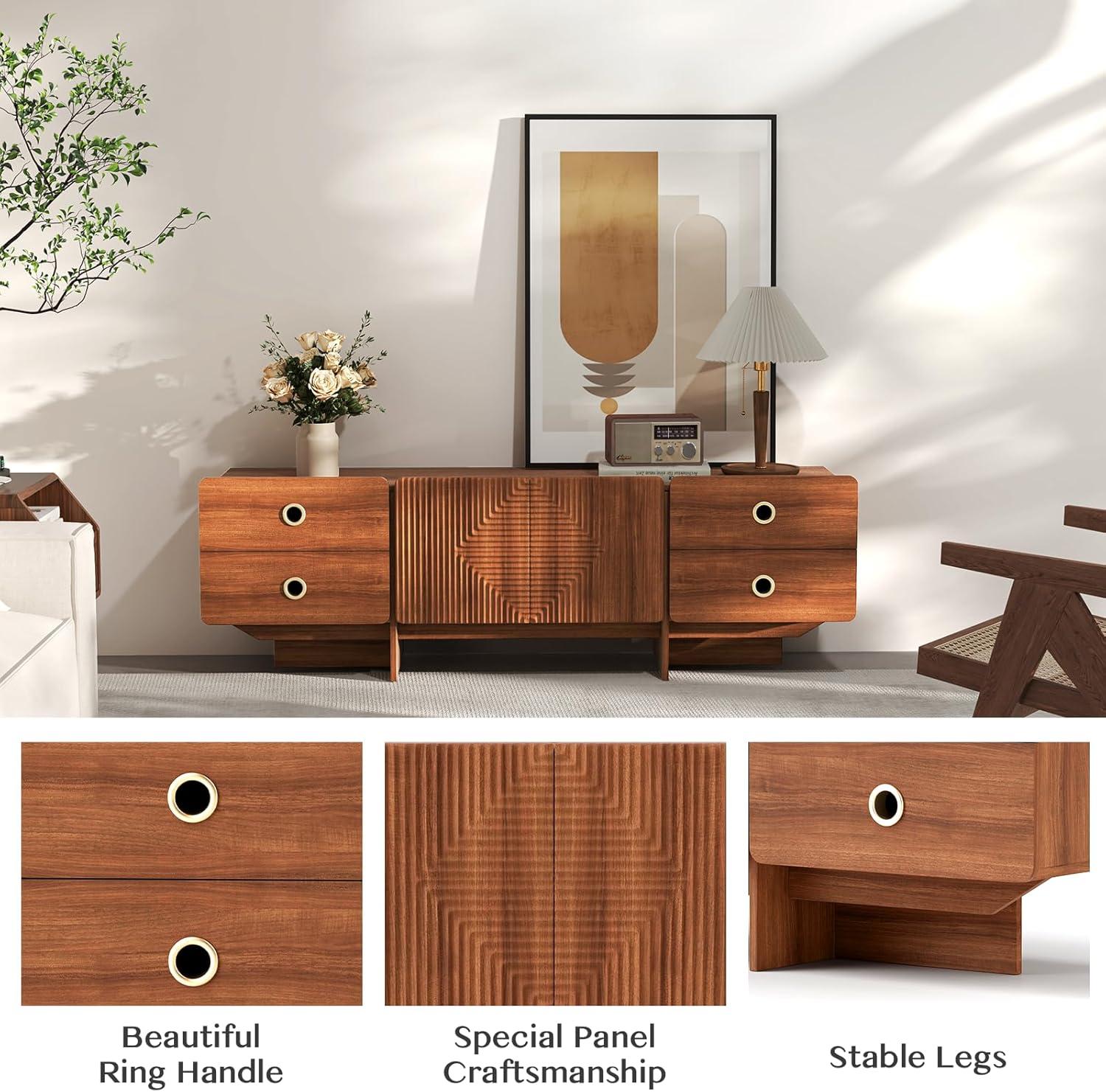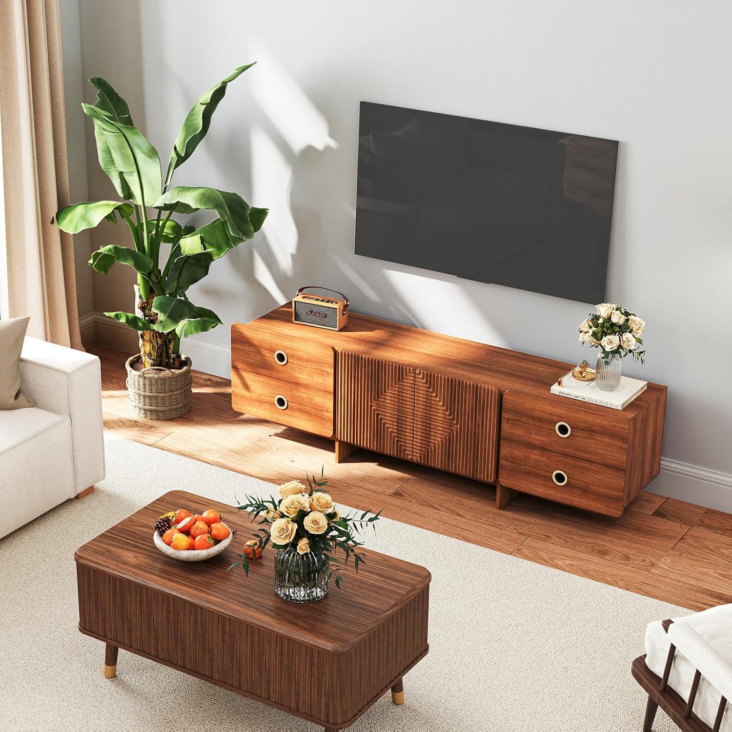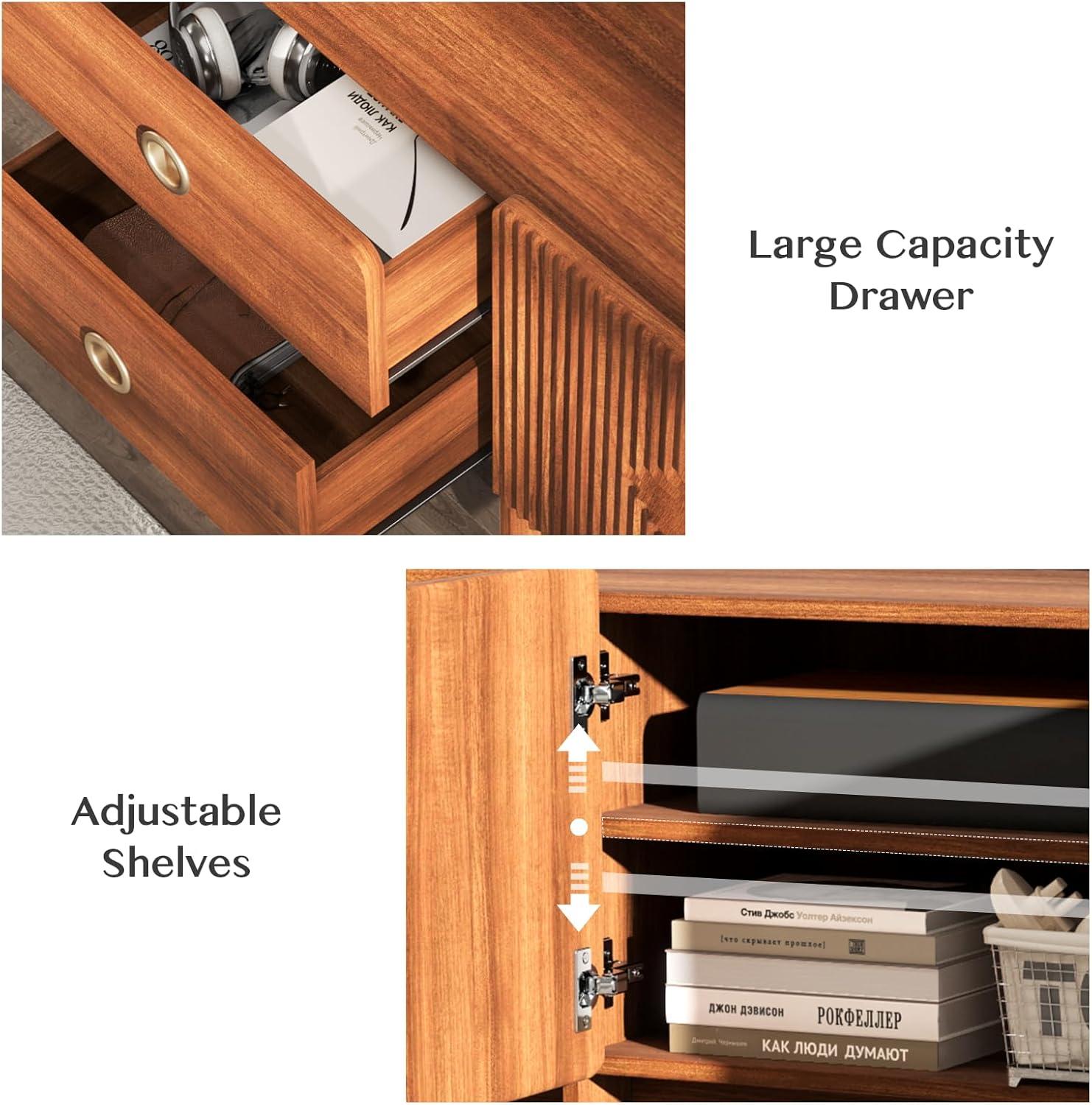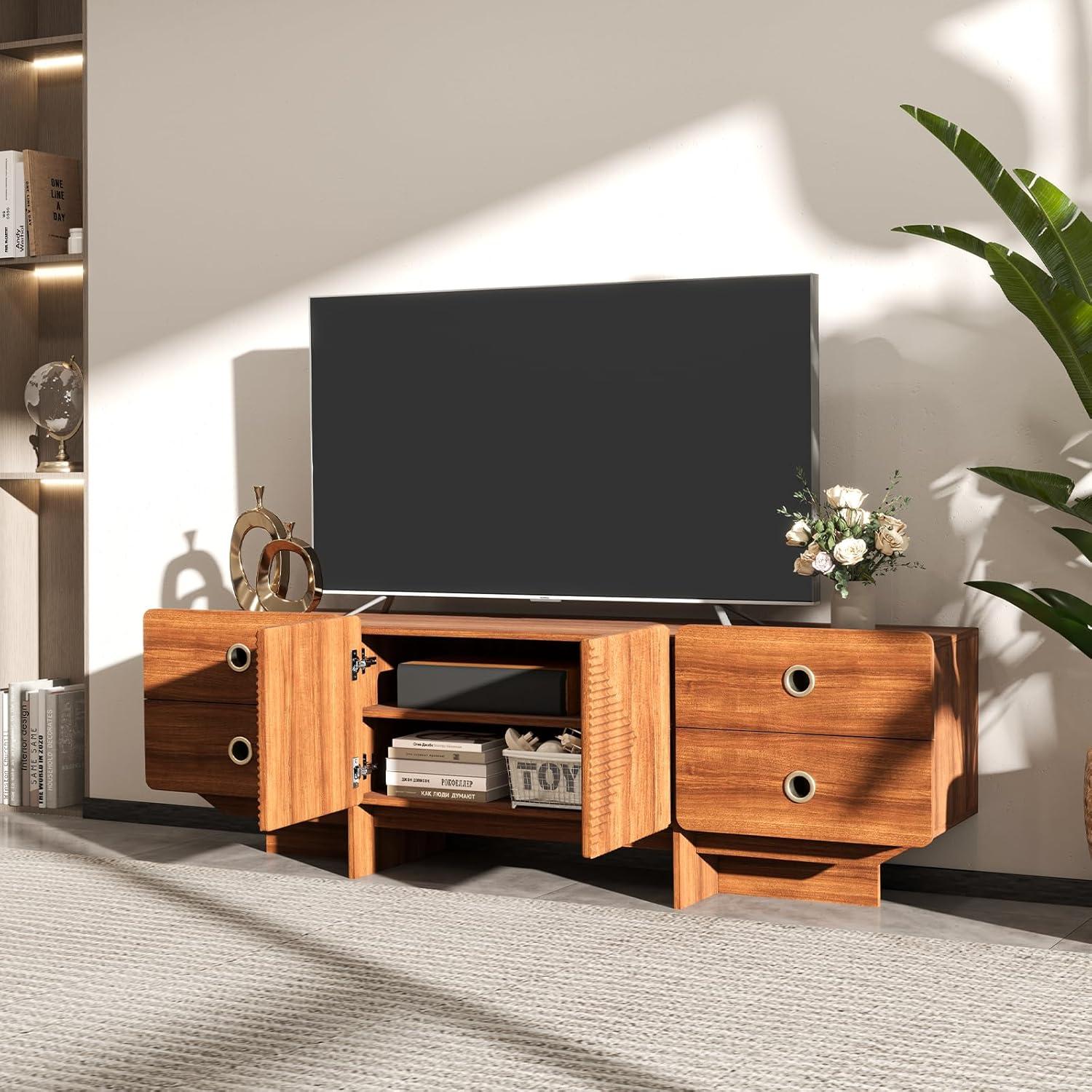 We’ve found that having ample, well-designed storage is essential for maintaining a clutter-free space, and this media console delivers just that. With four spacious drawers and additional cabinet storage, it easily accommodates remote controls, DVDs, gaming accessories, and other essentials without compromising on style. The easy-access drawers slide smoothly, making it convenient for daily use, while the large top surface comfortably holds our TV along with decor or soundbar equipment. Its versatile design fits perfectly in both living rooms and bedrooms, effortlessly blending function with a sleek, mid-century modern aesthetic.