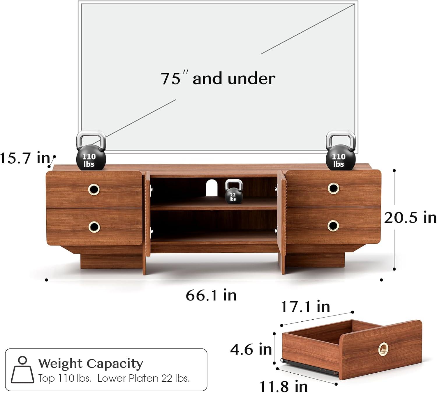 We’ve found this unit balances style and function seamlessly, making it an excellent addition to any living space. The rich cherry veneer captures the mid-century modern charm without screaming for attention, creating a warm focal point that complements a variety of decor styles, from boho to contemporary. measuring a agreeable 66 inches, it’s built to accommodate TVs up to 75 inches with ease, providing a sturdy platform that holds not only the TV but also soundbars and decorative items confidently, thanks to its robust engineered wood construction.