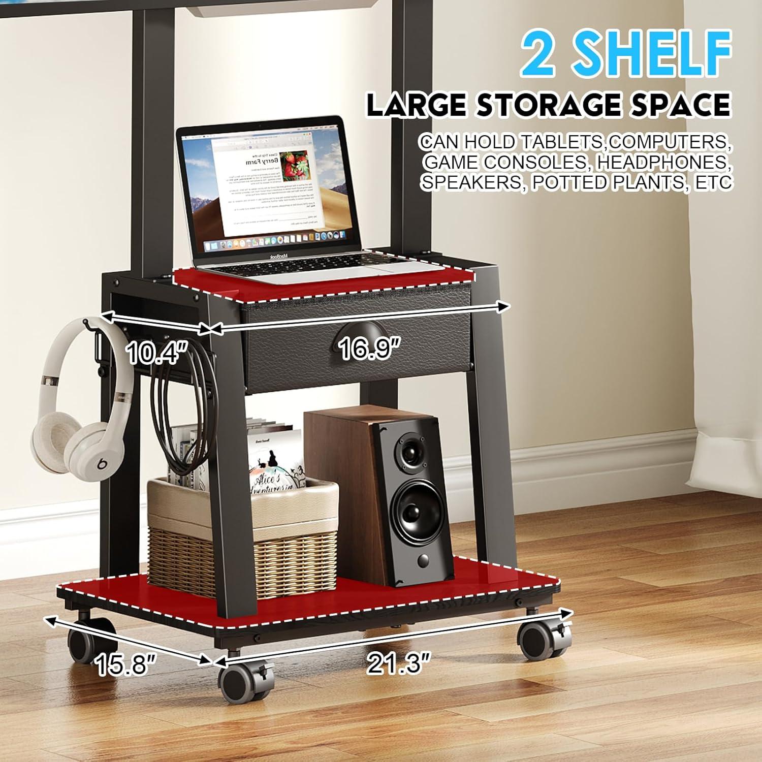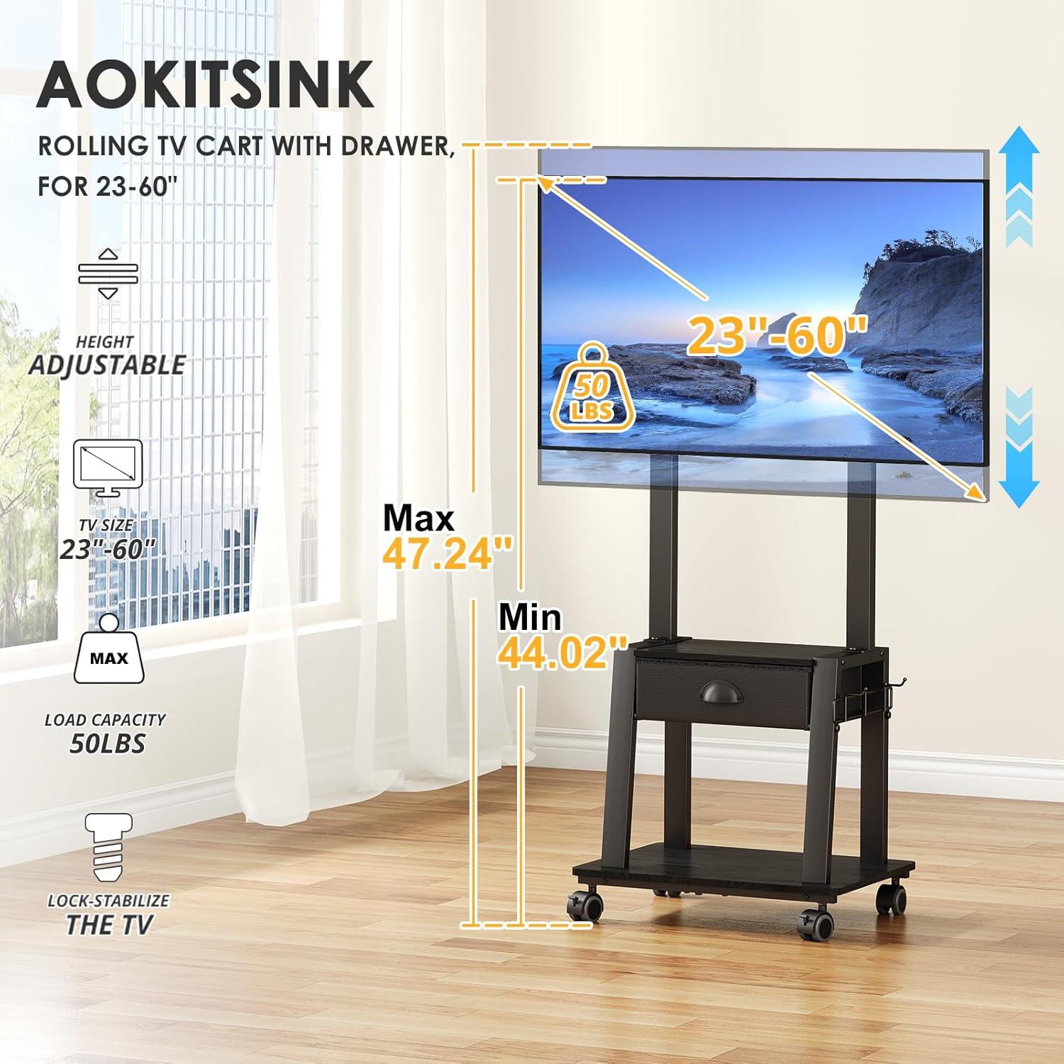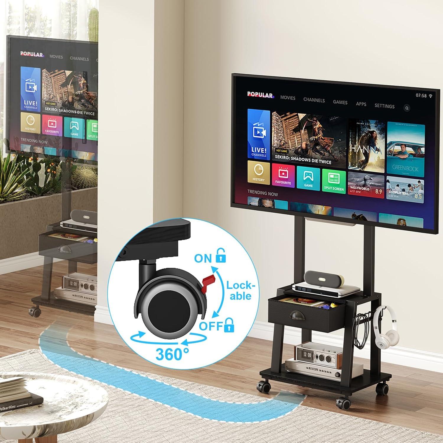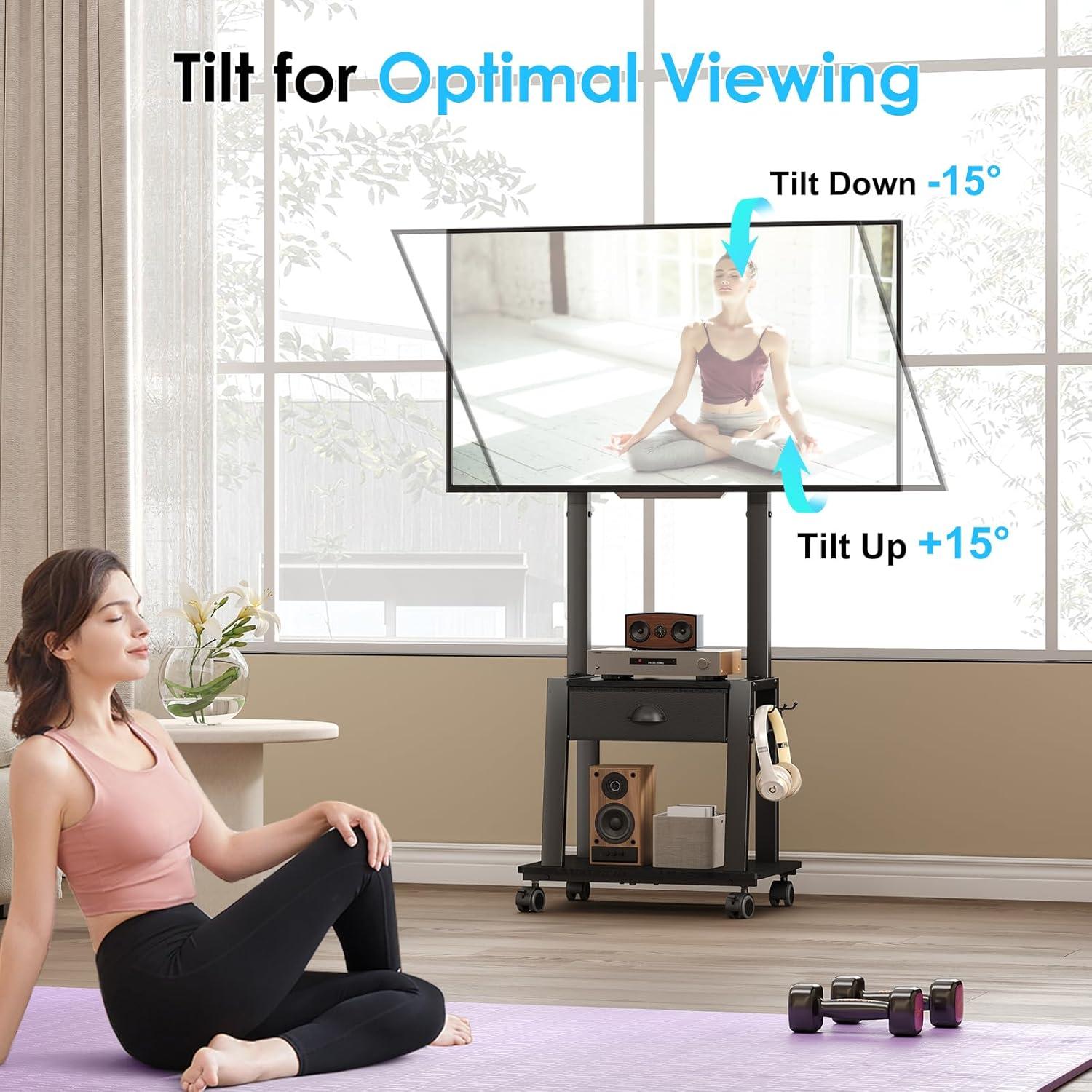 After a few weeks the Mobile TV Stand with Drawer for 23-60 Inch Flat/Curved screen,Tilt Rolling TV Cart on Wheels with 2 Shelves Adjustable Height Portable TV Stand Holds up to 50 lbs for indoor Outdoor Max VESA 400x400mm sits in the corner and begins to take on the small marks of everyday use. In daily routines it gets nudged for different angles, holds a remote or a stack of magazines, and shows the faint wear on surfaces from ordinary handling. As the room is used, the drawer tends to collect keys or odds and ends and the shelves fold into regular household rhythms rather than calling attention. Over time it simply rests and becomes part of the room.