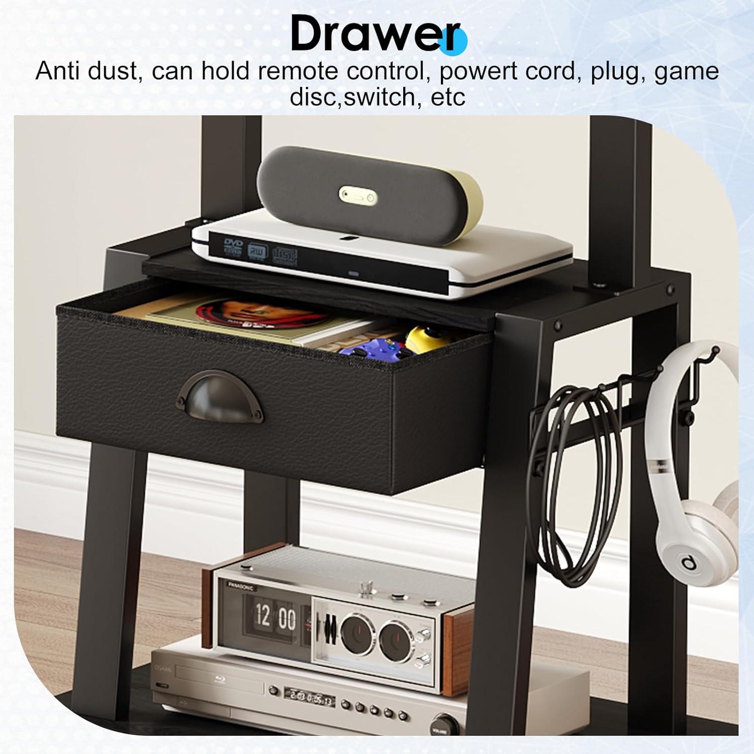 When you move the stand from room to room the two shelves and the drawer tend to get reconfigured to match how you use the space. In a living room setup you’ll often keep a small set-top box or streaming puck on the upper shelf directly beneath the screen, the drawer for remotes and spare batteries, and a heavier media player or game console on the lower shelf so the weight and vents sit lower. In a bedroom or guest room you might flip that arrangement—leave the lower shelf mostly clear for a bedside lamp or book and keep only a cable modem or charger on the upper shelf—so the appearance stays tidy when the TV isn’t the central focus. Outdoors the layout usually simplifies: one shelf reserved for a weather-resistant speaker or plugged-in power bank, the drawer left empty or used for a small cover, and electronics kept off the lowest surface if grass or uneven ground is involved. Small, habitual moves—wedging the cart slightly closer to a wall, unlocking a wheel to angle the screen away from sun glare, or sliding a console back a few inches—are common when you stage it in different spots.