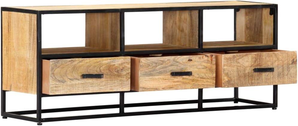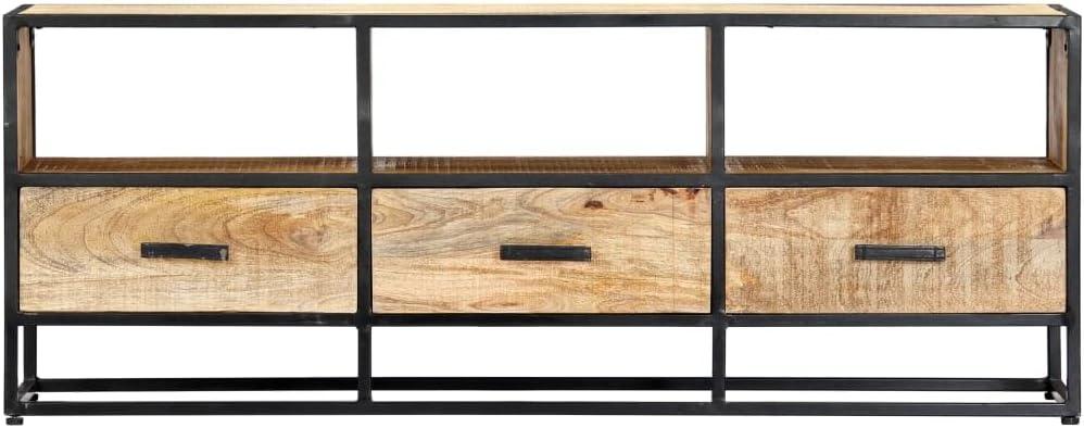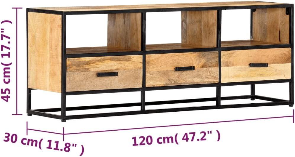 The Modern Rustic Industrial TV Stand, Durable Natural Mango Wood Entertainment Table with Robust Black Metal Frame for Living Room, Bedroom, Media Center settles into the room slowly, more noticed in small rhythms than in a single glance. Over time it gathers the light of morning cups and the occasional scuff from being moved, and in daily routines its top and edges take on the soft marks of use. As the room is used for quiet evenings or quick breakfasts, it quietly influences where people sit and how cushions are arranged, fitting into regular household rhythms. It stays.