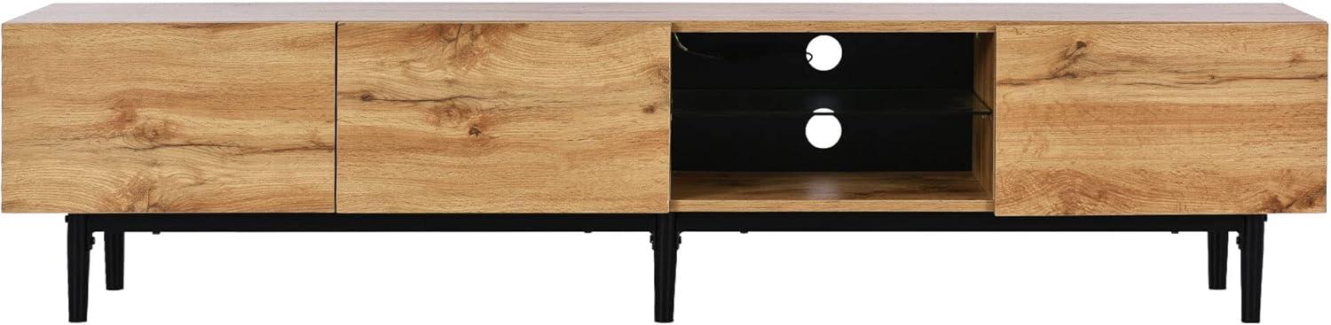 In everyday use the stand tends to sit as a low, stabilizing element in the room, leaving visual breathing space above the screen and a clear surface for medium-length components. It accommodates a mix of visible and hidden storage needs: open shelves keep cable boxes and consoles within sight and ventilation, while enclosed compartments let smaller items disappear from view. Normal household routines — sliding a game console forward to swap discs, moving a router slightly to improve reception, or shifting decorative objects to avoid glare from the LED glow — are easily carried out without major rearrangement. Small, frequent adjustments are common; the layout supports them rather than forcing a complete rethink of the entertainment area.