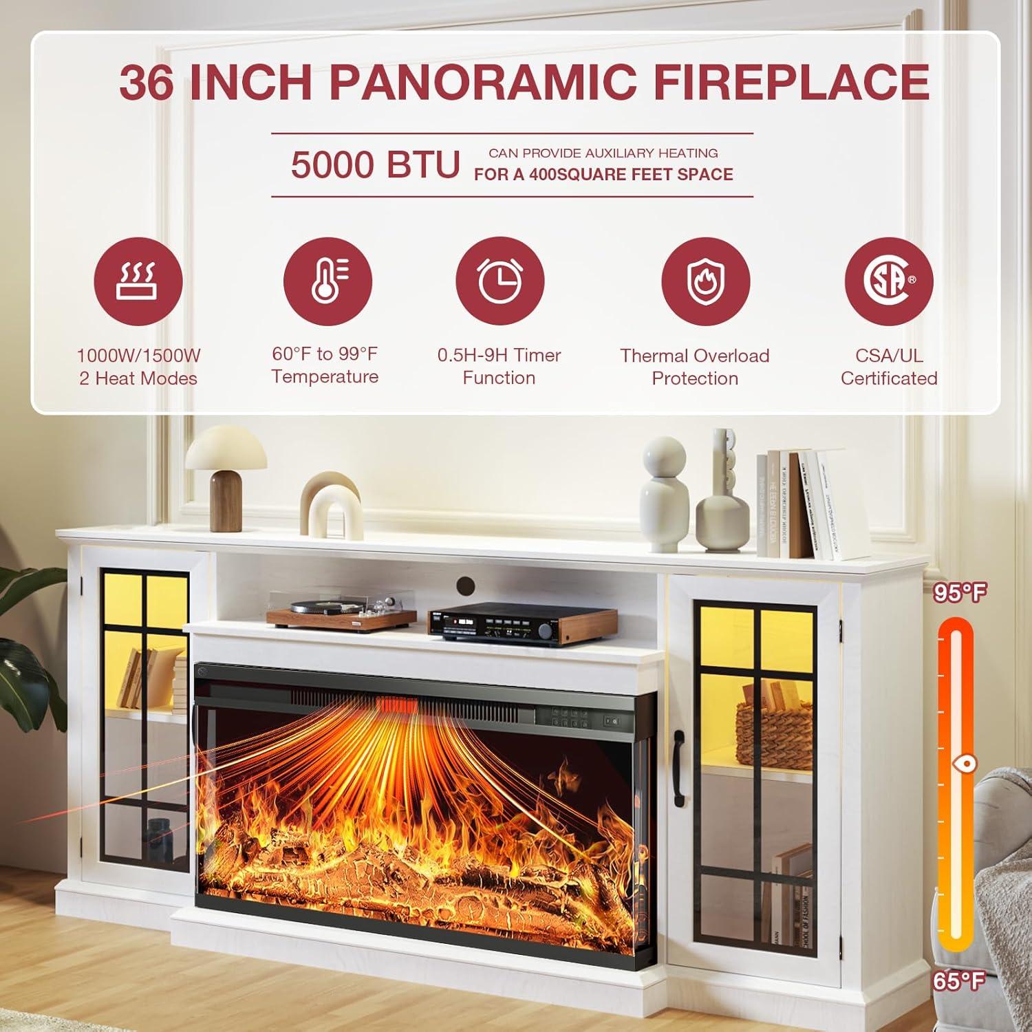 Late afternoon light slides across the console and you notice its visual weight before anything else. the oneinmil 36 Inch 3-Sided Glass Fireplace TV Stand for TVs up to 80 — hereafter the 36-inch TV stand — has a low, broad silhouette in distressed white that quietly anchors the room. Up close, the painted wood frame feels a little toothy under your fingertips while the glass panels catch and soften the light; the doors swing with a restrained, confident click. from where you stand the piece reads like farmhouse without costume jewellery: solid in scale,with enough layered texture to feel lived-in rather than staged.