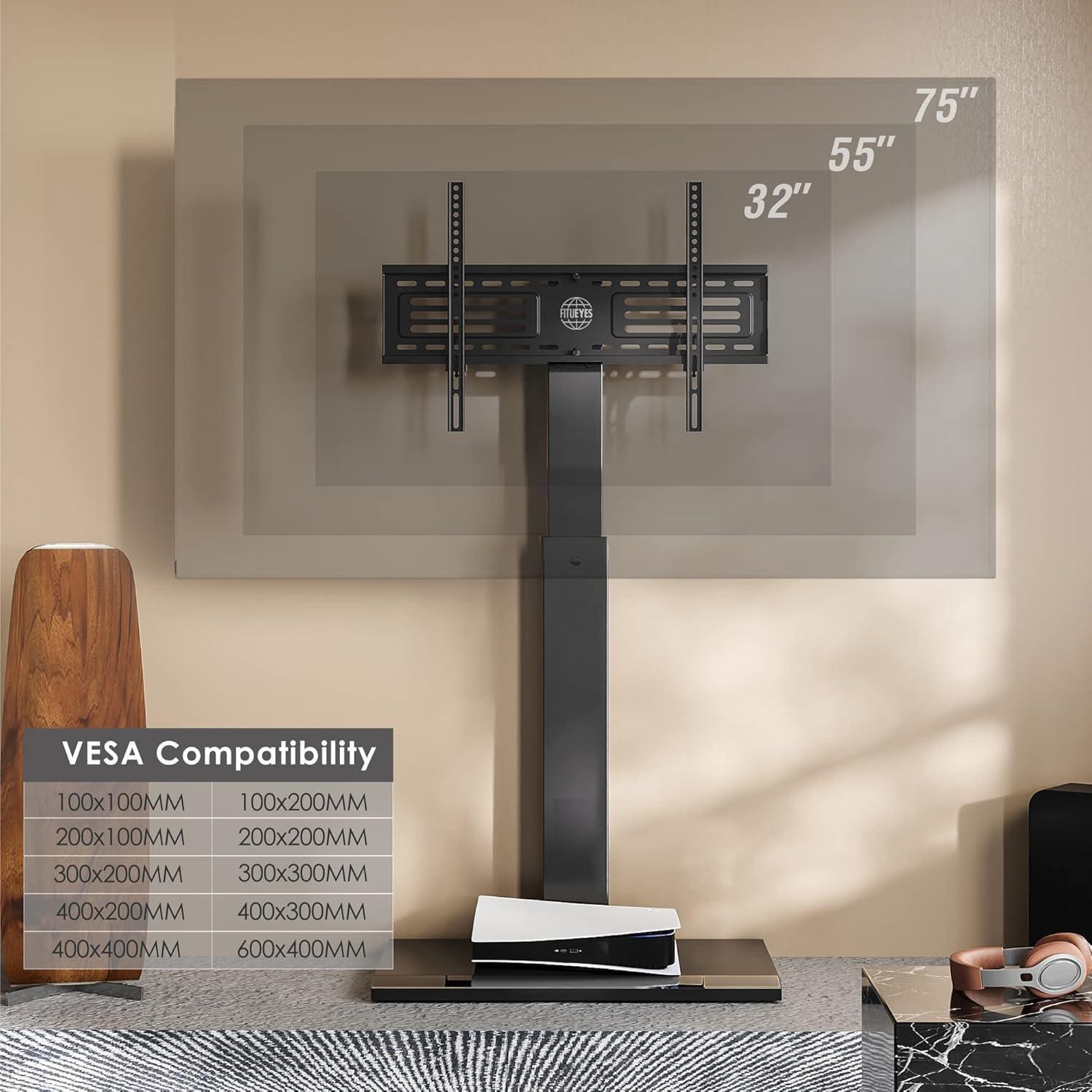 the FITUEYES TV stand impresses us with its robust iron construction and sleek, minimalist design. The swivel and height adjustment bring flexible viewing options to the table, ideal for various room layouts.while assembly isn’t a one-person job for bigger sets, the instructions make it accessible for most users willing to team up. We’d recommend this stand especially if you need a stable, space-saving solution without drilling walls, but recommend keeping an eye on the swivel mount and hardware to ensure nothing loosens with time.