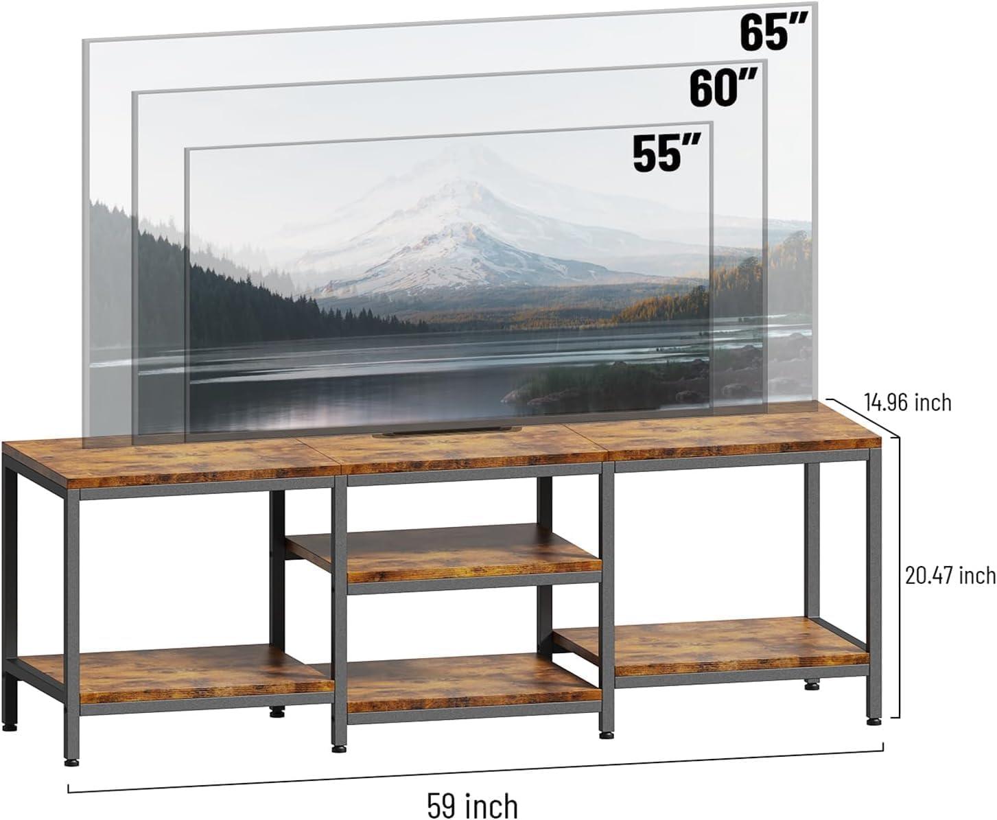 We appreciate the blend of rustic charm and industrial robustness that this TV stand brings to any living space. Its combination of retro wood grain finished shelves and a black metal frame crafts an inviting, vintage ambiance while maintaining a modern edge. measuring 59 inches in length and standing 20.5 inches tall, it fits most televisions up to 65 inches comfortably, making it a versatile choice for diverse room sizes and stylistic preferences.