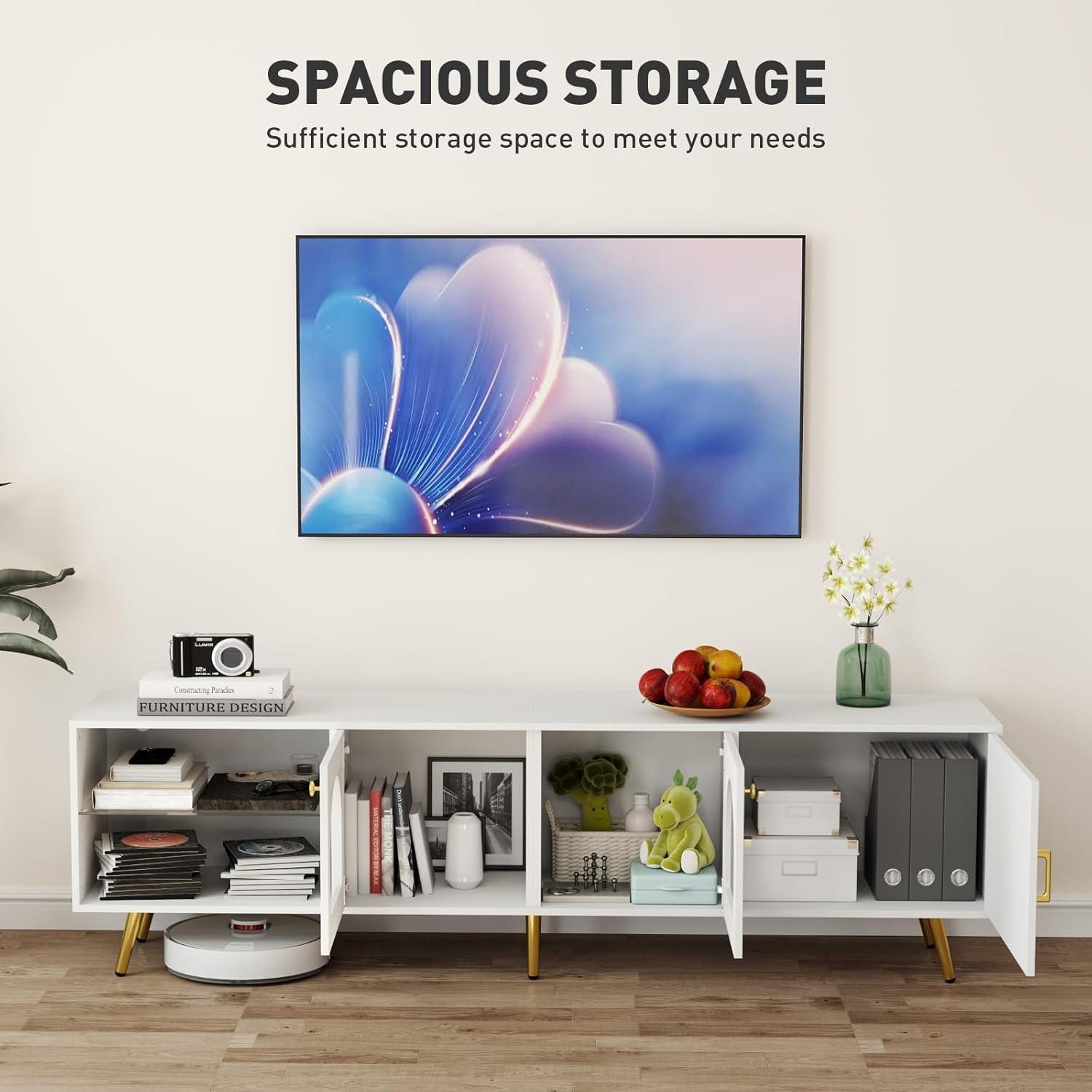 After spending considerable time with this entertainment console, we appreciate how its sleek modern design effortlessly elevates the aesthetic of any living room or bedroom. The contrast of the white finish with golden legs creates a subtle yet sophisticated presence that doesn’t overpower the space. Functionality is equally impressive – the combination of open shelves and closed cabinets provides ample storage, keeping media accessories organized and within easy reach. The built-in LED lights add a gentle ambiance that enhances movie nights or casual TV time, creating an inviting atmosphere with minimal effort.