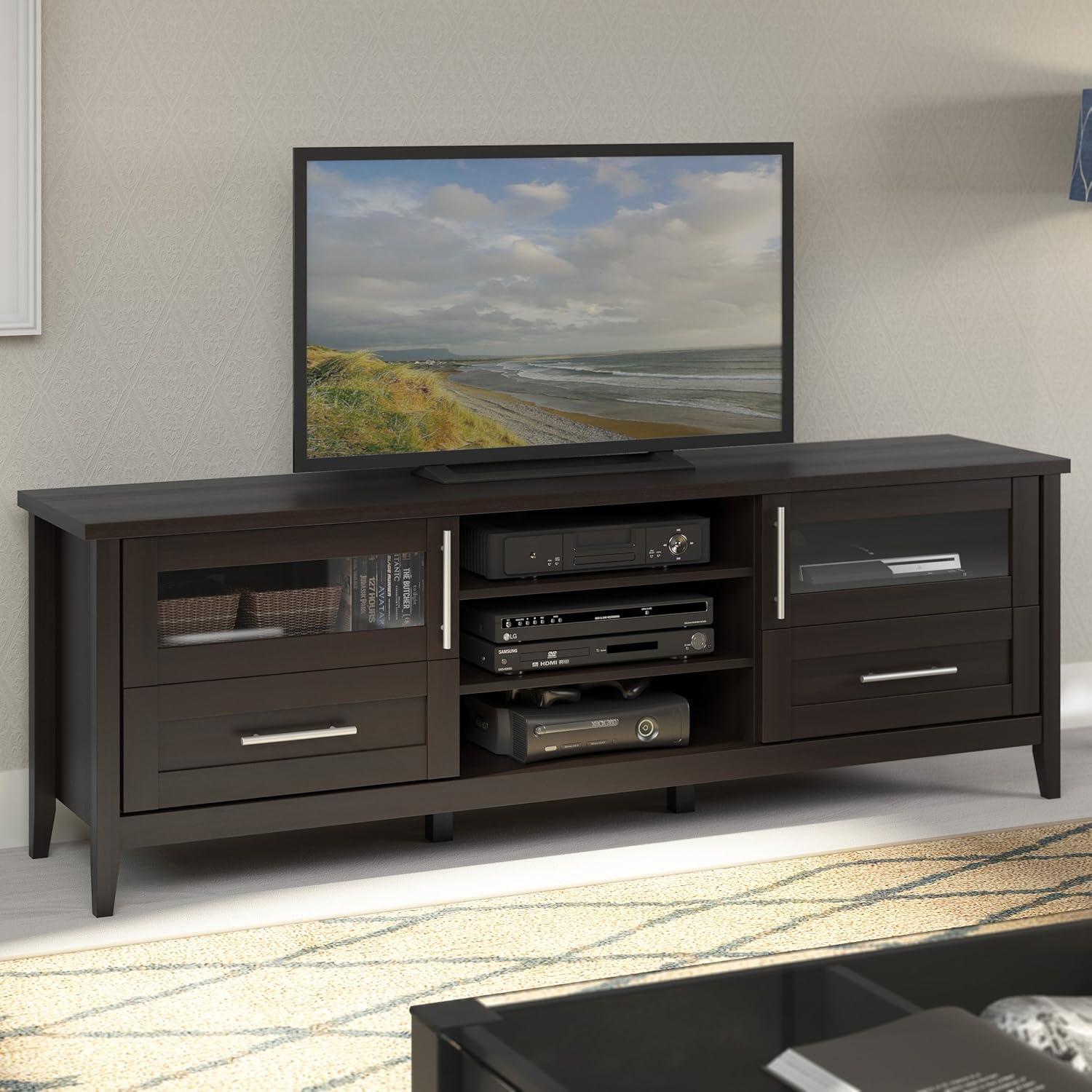 When it comes to placement, the compact yet extra-wide design offers versatility for various room layouts. Its neutral espresso finish,highlighted by imitation nickel handles and glass doors,blends seamlessly into modern or customary interiors. The open shelves and concealed drawers provide flexible storage, perfect for organizing a variety of AV components without clutter. Whether positioned in your living room, media room, or even a spacious hallway, it maintains an elegant presence without overwhelming the space.