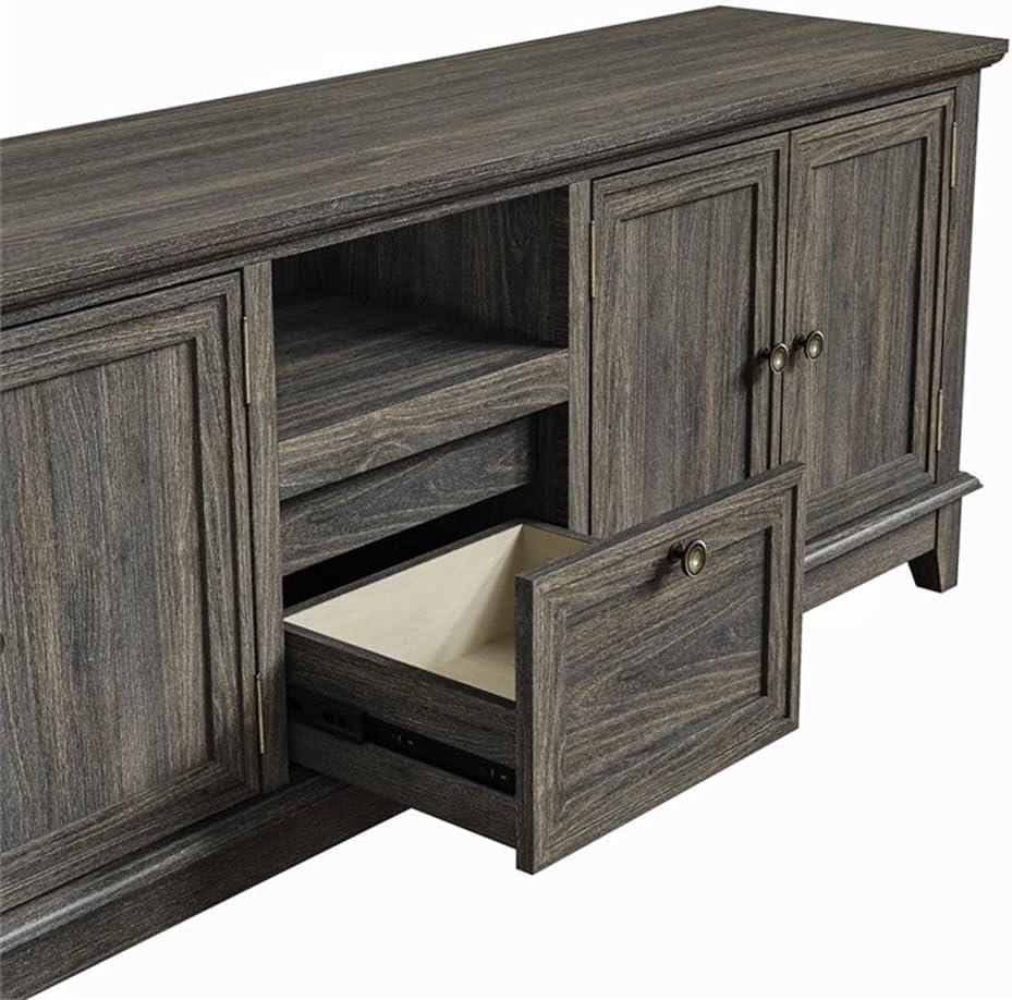 This TV stand effortlessly merges rustic charm with modern functionality, making it a centerpiece in any living room. Crafted from durable medium-density fiberboard with a rich dark brown finish,it boasts a striking wood-grain textured top that adds warmth and character to your space. The design cleverly incorporates two spacious cabinets flanking a central drawer, providing ample concealed storage that helps keep media clutter out of sight. Adjustable shelves within the cabinets offer versatile organization options, adapting seamlessly to accommodate a variety of electronics, décor, or other essentials. The metal hardware and fast-install hinges not only enhance durability but also simplify assembly, reducing setup time and effort.
