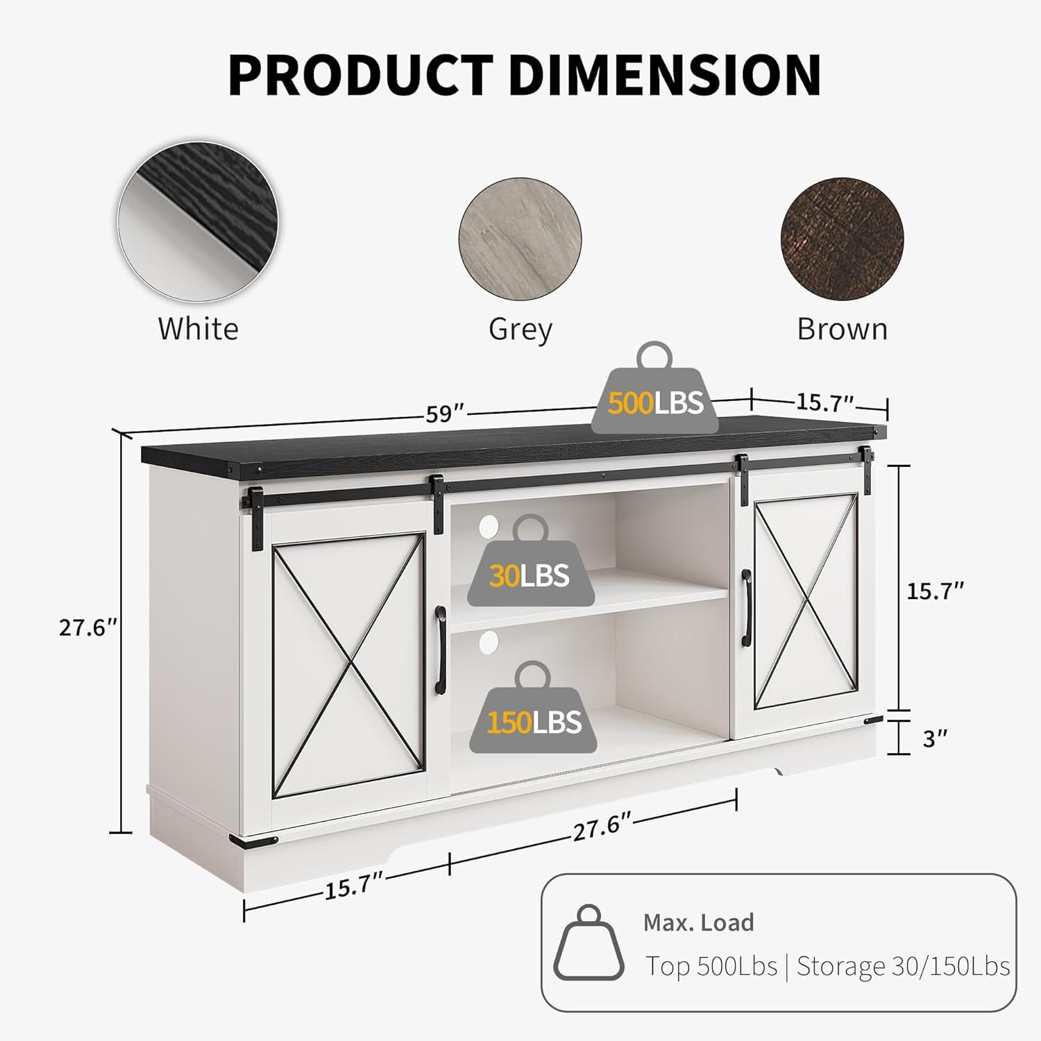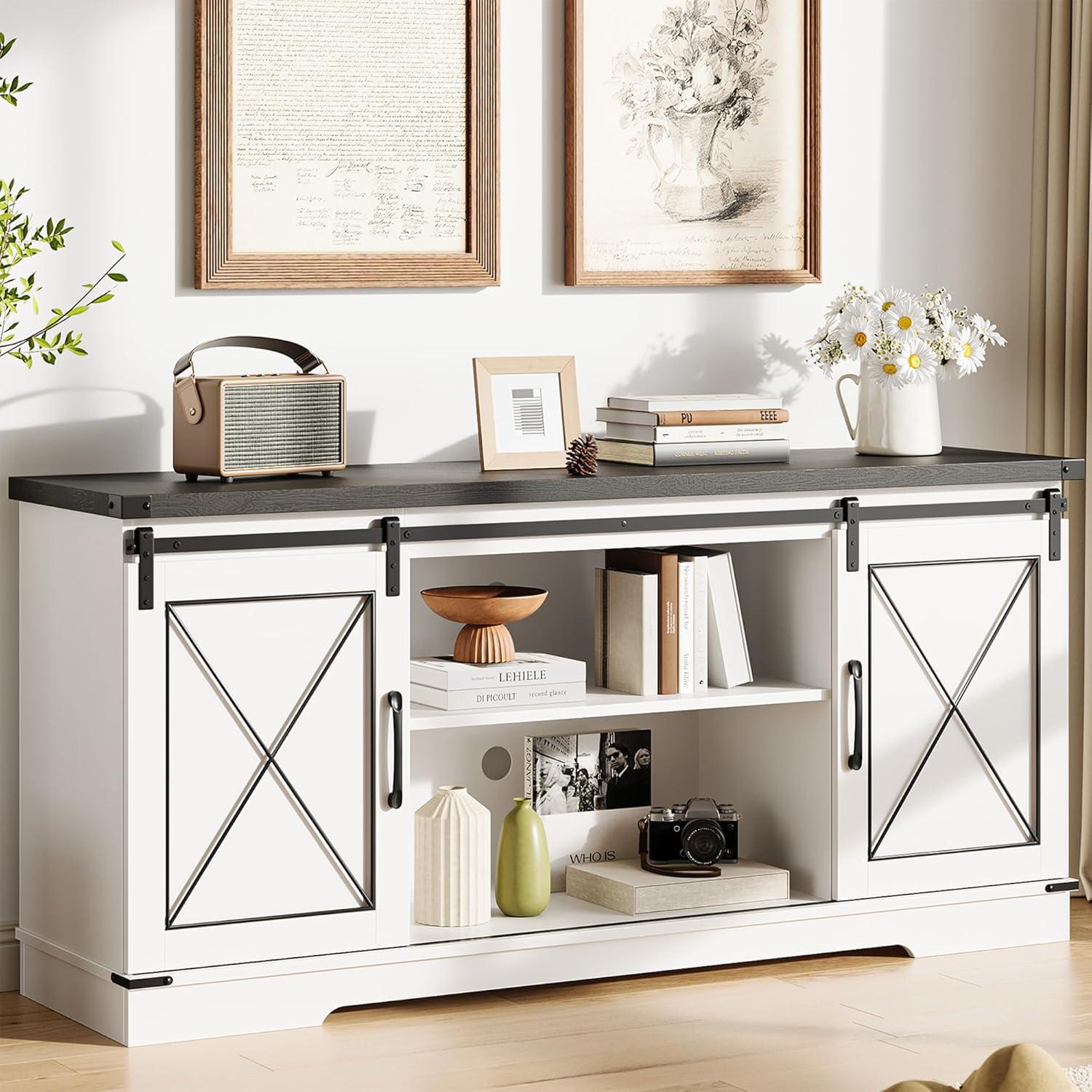 We find this farmhouse TV stand to be an elegant blend of rustic charm and practical design. its sliding barn doors not only add a tasteful vintage aesthetic but also operate smoothly, giving us easy access to the storage areas without compromising on style. the contrasting white and black finish offers a chic yet timeless look that fits seamlessly into a variety of living room decors. With overall dimensions of 59″L x 15.7″W x 27.6″H, it comfortably supports flat-screen TVs up to 65 inches while providing expansive tabletop space for additional media accessories.