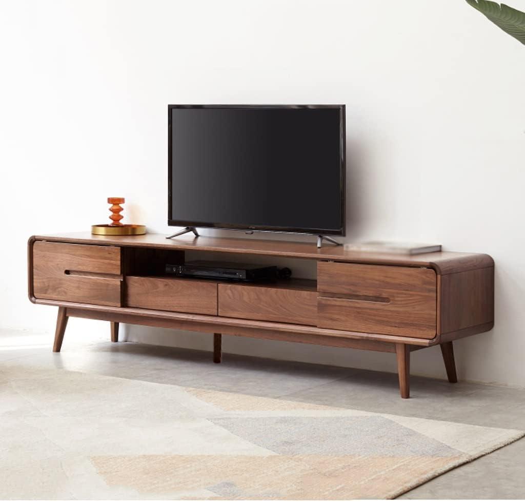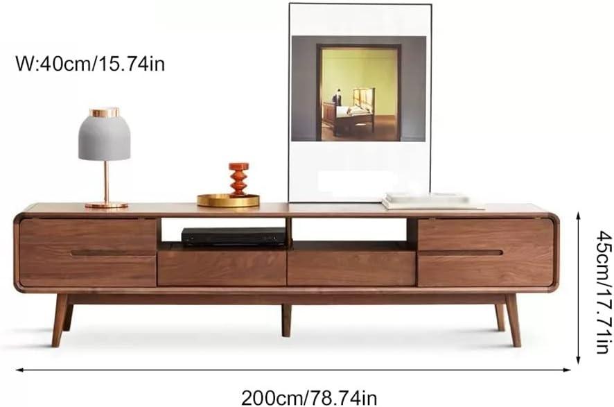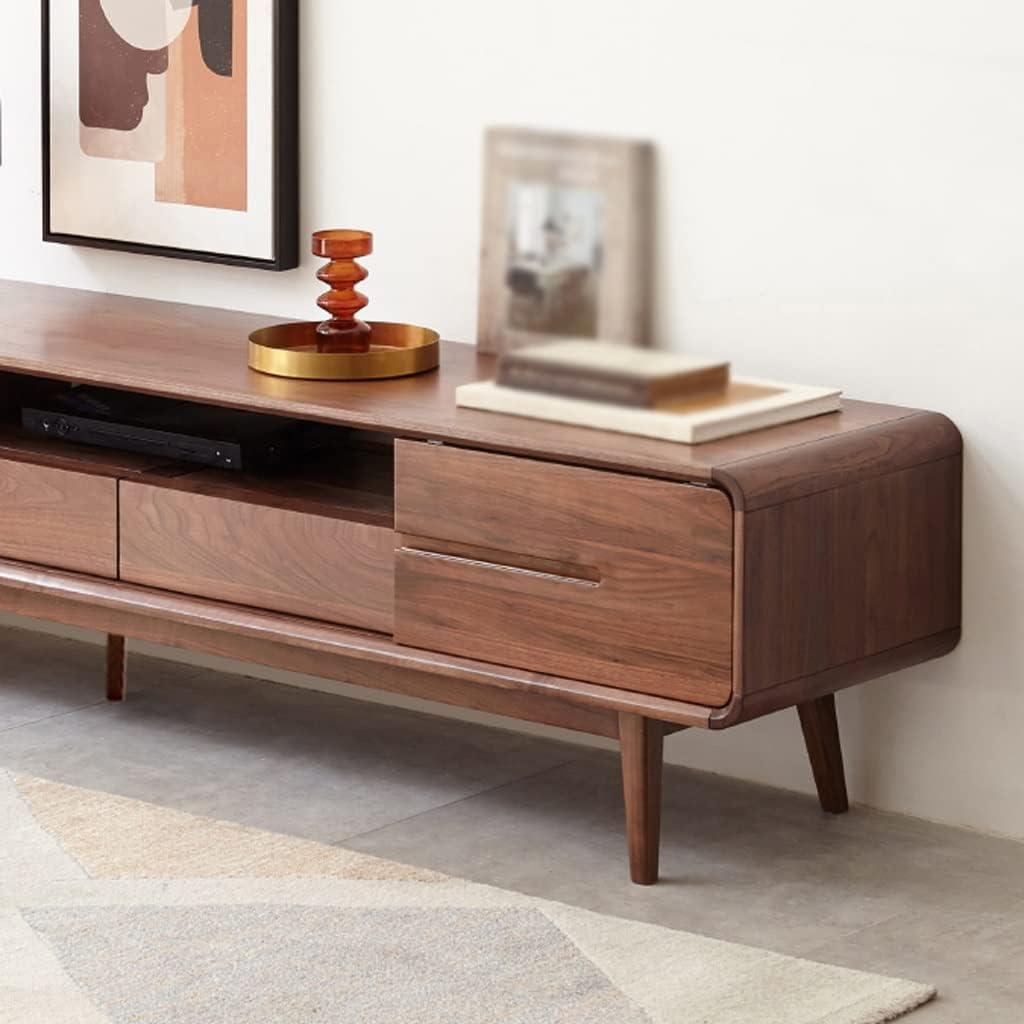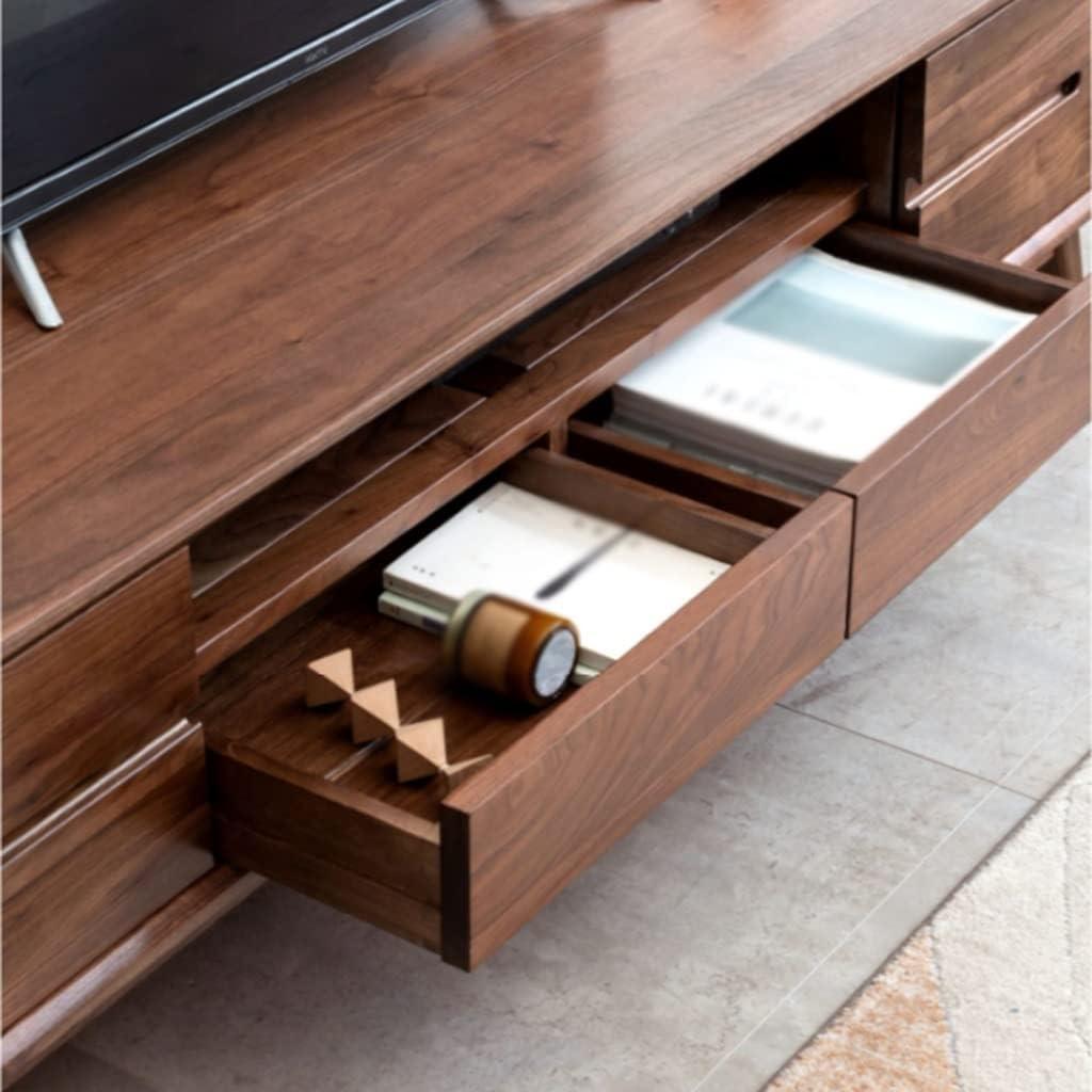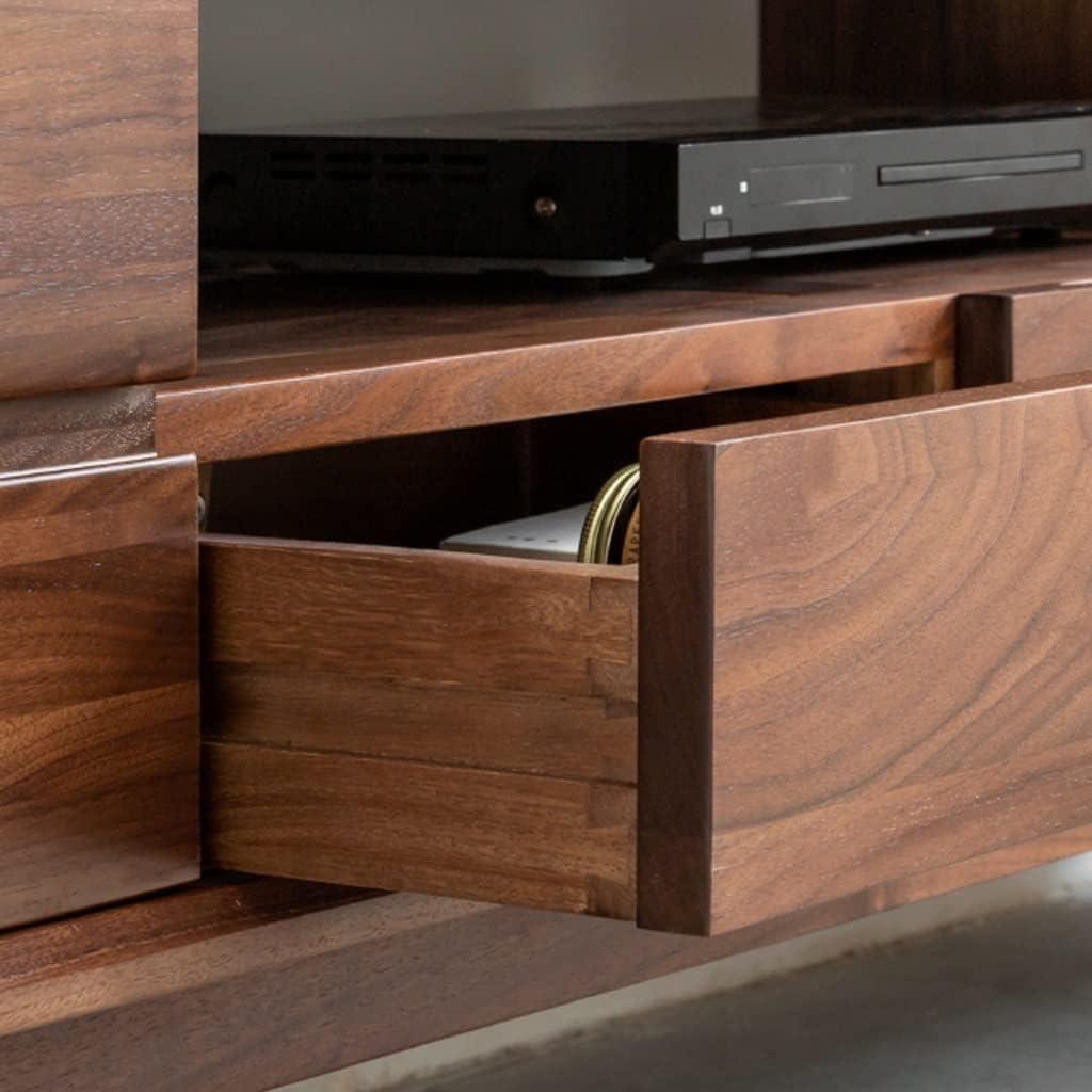 The combination of four spacious drawers and open shelves offers a well-thought-out balance between concealed and accessible storage. The drawers provide ample room to tuck away miscellaneous items like remote controls, manuals, and other accessories, leaving the surface clutter-free. Constructed from high-quality black walnut, these drawers slide smoothly without compromising sturdiness, ensuring long-term reliability. Meanwhile, the open shelves are perfect for showcasing electronic devices such as routers, DVD players, and audio equipment, allowing for easy access and proper ventilation to prevent overheating. Cable management holes cleverly hidden at the back maintain a clean and organized appearance by keeping wires out of sight.
