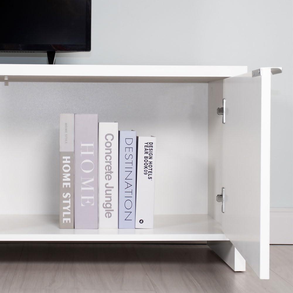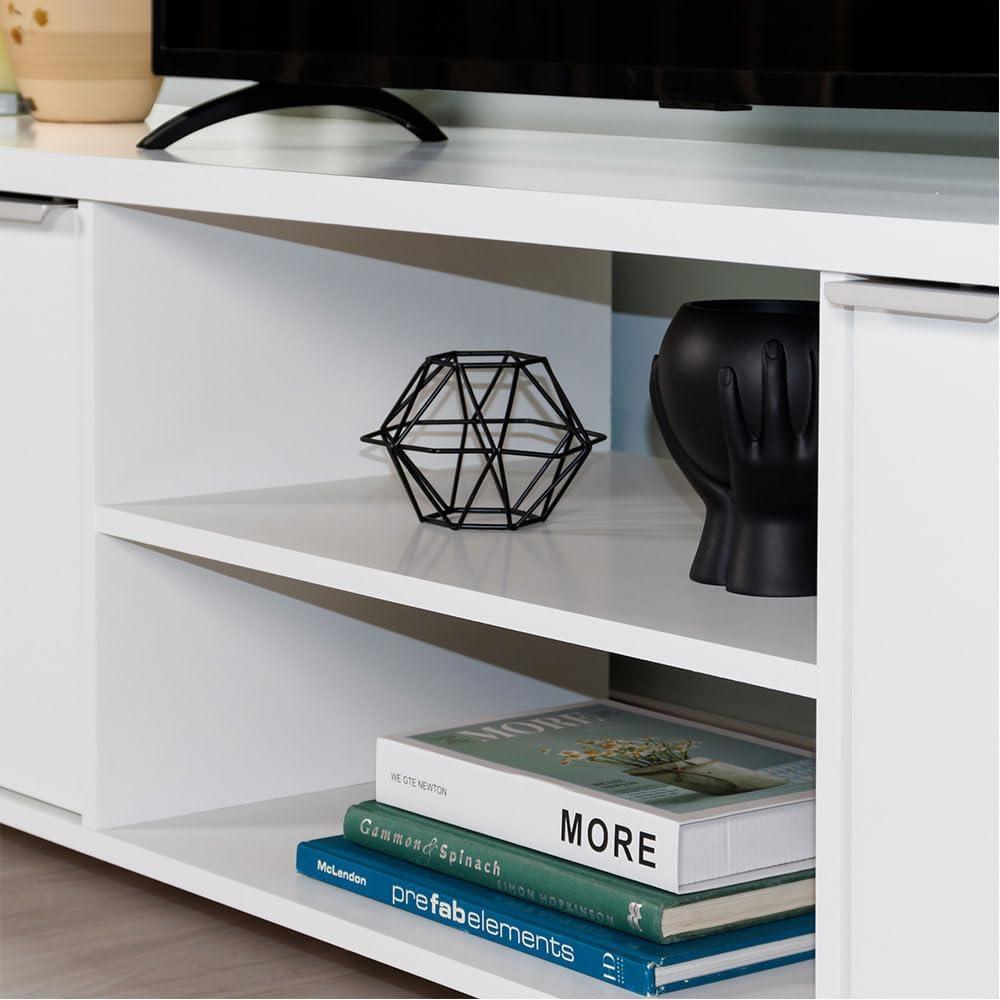 We appreciate how the stand seamlessly blends a modern aesthetic with practical design. The sleek white finish is both clean and versatile, brightening any living room while complementing various décor styles. Crafted from high-quality particle board made of renewable wood, the cabinet offers durability without sacrificing elegance. The smooth surface and subtle grain texture add a touch of warmth, making it far from the cold, sterile white furniture often seen. The built-in metallic handles lend a refined contrast, enhancing the minimalist yet sophisticated look.