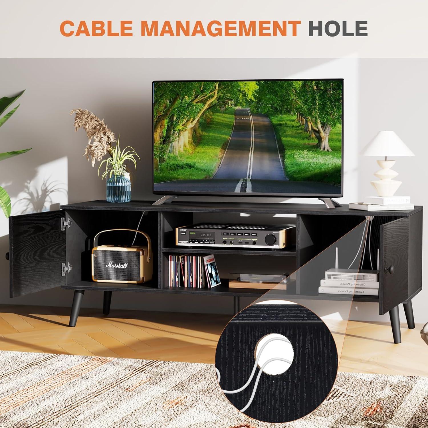 Embodying mid-century modern aesthetics, this entertainment center harmonizes form and function effortlessly. Its clean lines, dark black finish, and wooden feet create a stylish yet understated presence that complements diverse interior styles-from cozy bedrooms to spacious living rooms. The design thoughtfully integrates 2 large cabinets with soft-close hinge doors, offering generous storage space while maintaining a sleek silhouette. Beyond aesthetics, practical touches such as cable management holes behind each cabinet let us keep cords and devices like routers or consoles neatly out of sight,preserving a clutter-free environment.