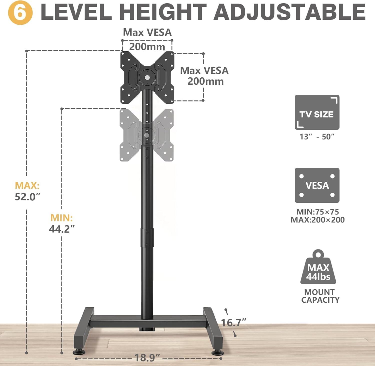 This floor stand is designed to support televisions and monitors ranging from 13 to 50 inches, with a maximum weight capacity of 44 pounds. Its versatile VESA compatibility-from 75x75mm up to 200x200mm-makes it an excellent choice for a wide variety of popular TV brands and models. The mount allows easy rotation between portrait and landscape modes,accommodating different viewing preferences whether you’re gaming,coding,attending online meetings,or displaying content at events. Plus, with 6 height adjustment options between 44.2 inches and 52 inches and a screen tilt range of -2° to +10°, it helps optimize viewing comfort regardless of your seating arrangement.