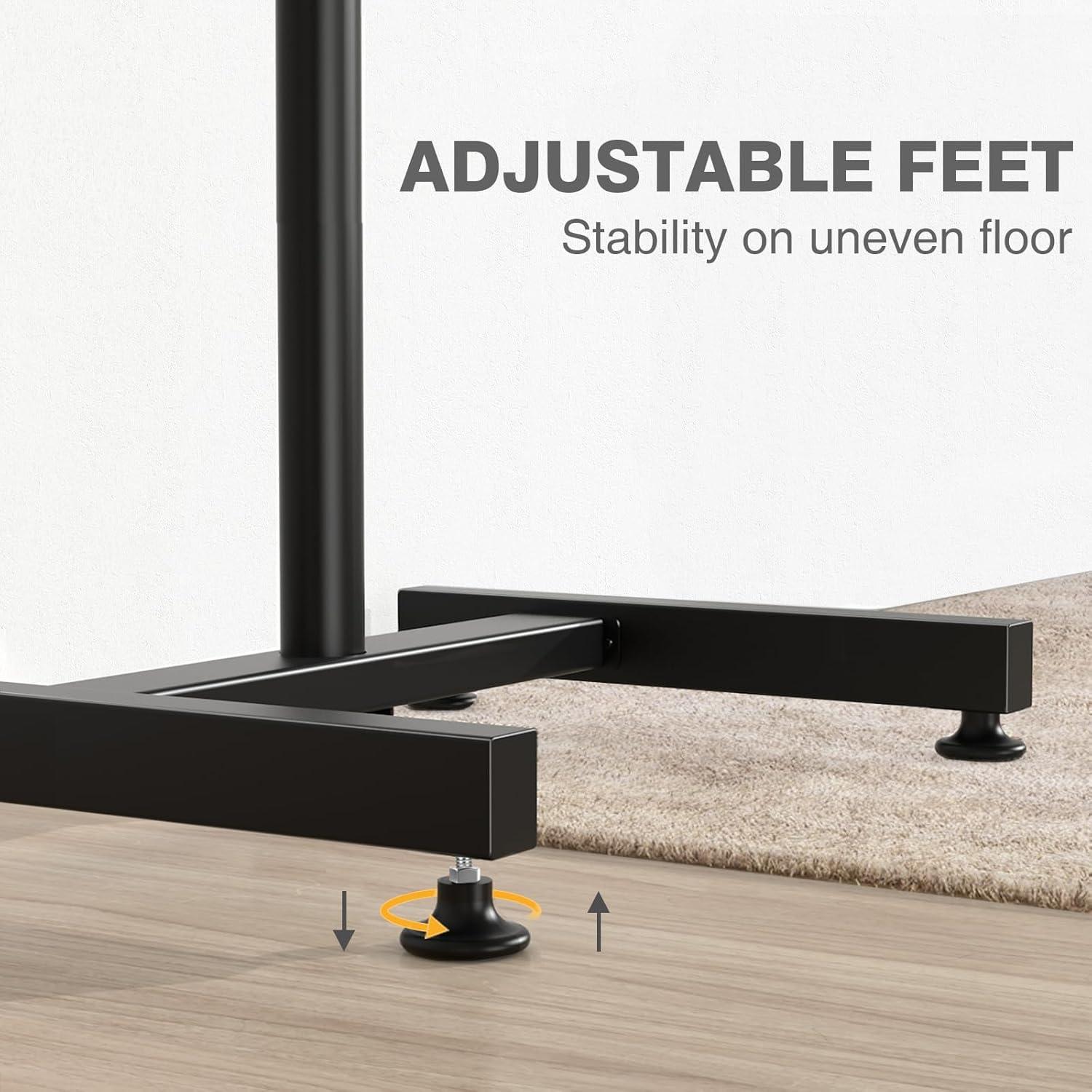| Adjustable sturdy feet and included wheels keep the stand stable even on uneven floors | Wheels might roll if not locked properly, potentially affecting stability on smooth surfaces |