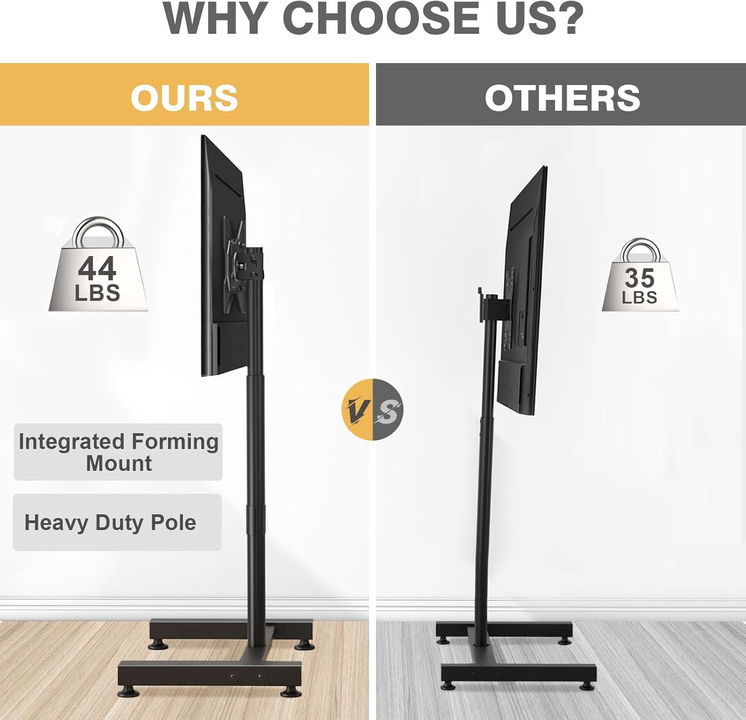 One of the standout features of this floor stand is its impressive compatibility range. It supports TV screens from 13 to 50 inches, making it suitable for a variety of living spaces – from cozy bedrooms and dorm rooms to offices and studios. Whether you have a compact 24-inch monitor or a larger 45-inch curved screen,this mount ensures a solid hold for displays weighing up to 44 lbs. This flexibility is perfect for those who might upgrade or switch TVs frequently without needing to invest in a new mount each time.