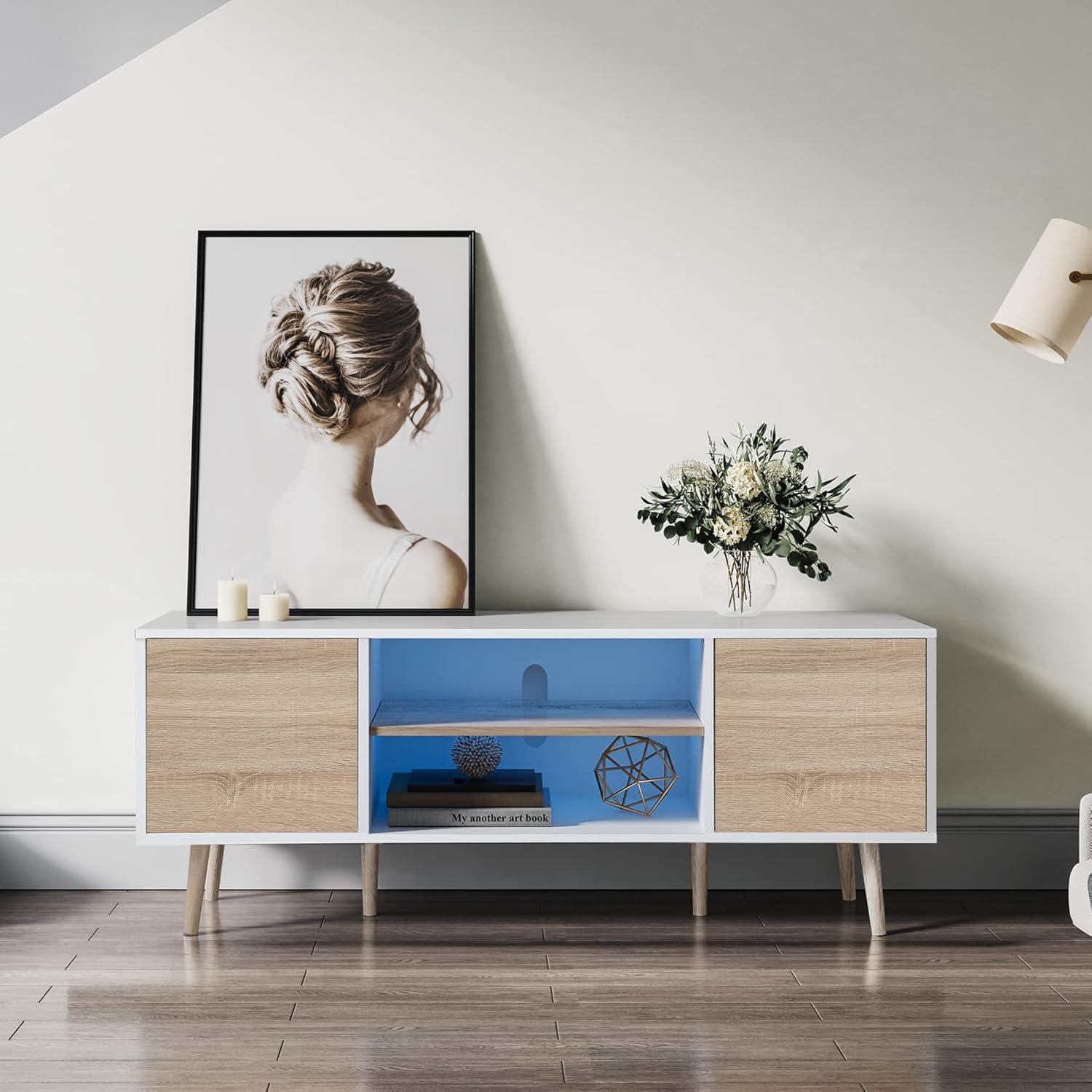 This piece beautifully fuses mid-century modern aesthetics with practical functionality, making it a standout addition to any living room or bedroom. With a smooth white and oak finish, it delivers a clean, complex look that blends seamlessly with a variety of decor styles. the standout feature is the subtle blue LED lighting, which not only elevates the ambiance but also enhances the entertainment experience, whether you’re watching movies or gaming. Its compact dimensions make it suitable for spaces that demand style without overwhelming size, providing a charming retro flair along with modern sensibility.