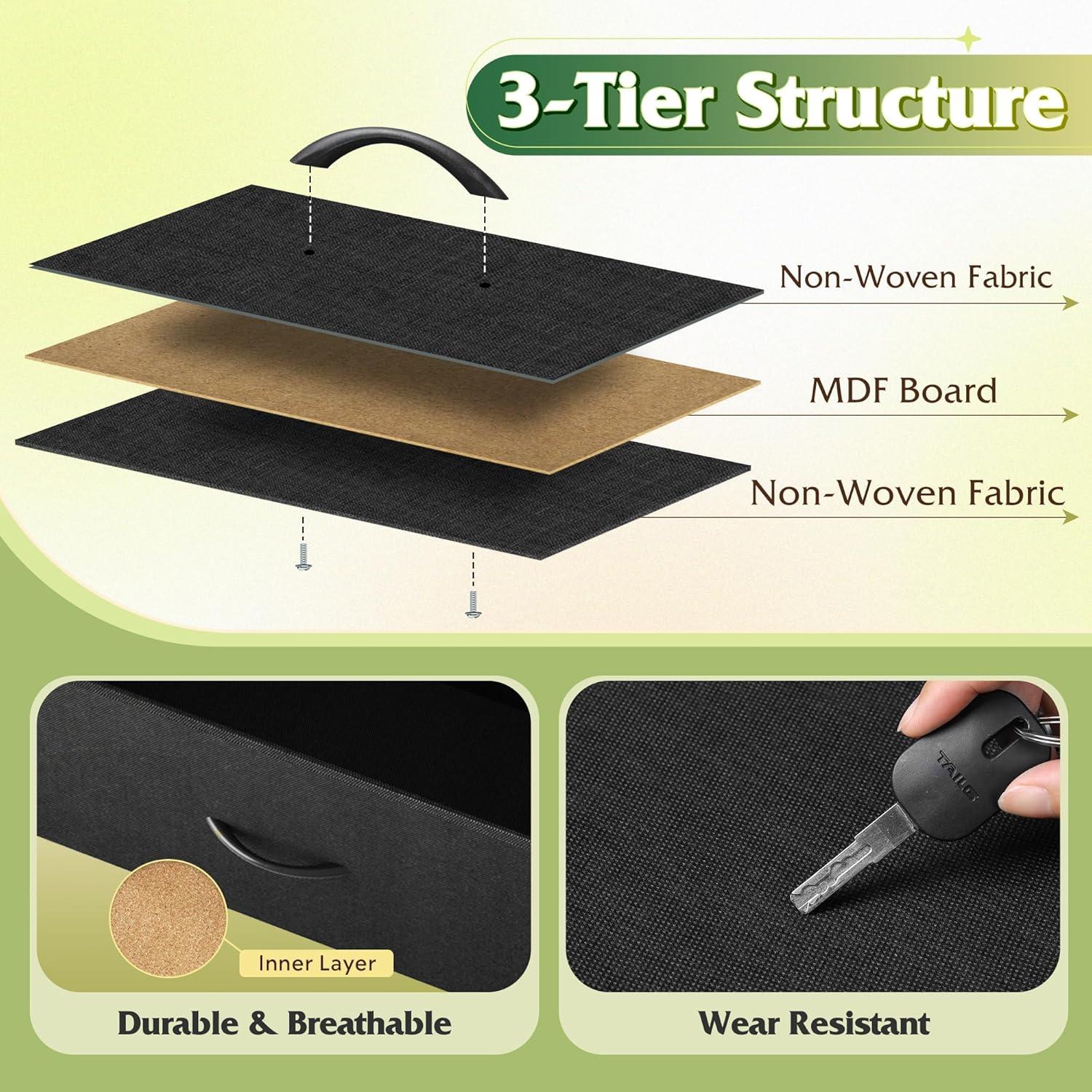 After consistent daily use, we’ve found the build quality to be impressively sturdy and reliable. The thickened 15mm metal steel frame with cross support rods delivers excellent stability, comfortably holding up to 150 pounds without any noticeable wobble. The anti-tilt feature allows for secure wall anchoring, enhancing safety especially in homes with children or pets. The spacious wood top resists scratches and is simple to maintain, thanks to its P2 grade artificial wood surface. One highlight has been the fabric drawers: constructed with triple-layer fiberboard, PVC coating, and breathable non-woven fabric, they hold up well under frequent use but do require a bit more gentle handling compared to solid wood drawers to avoid overstretching or sagging.