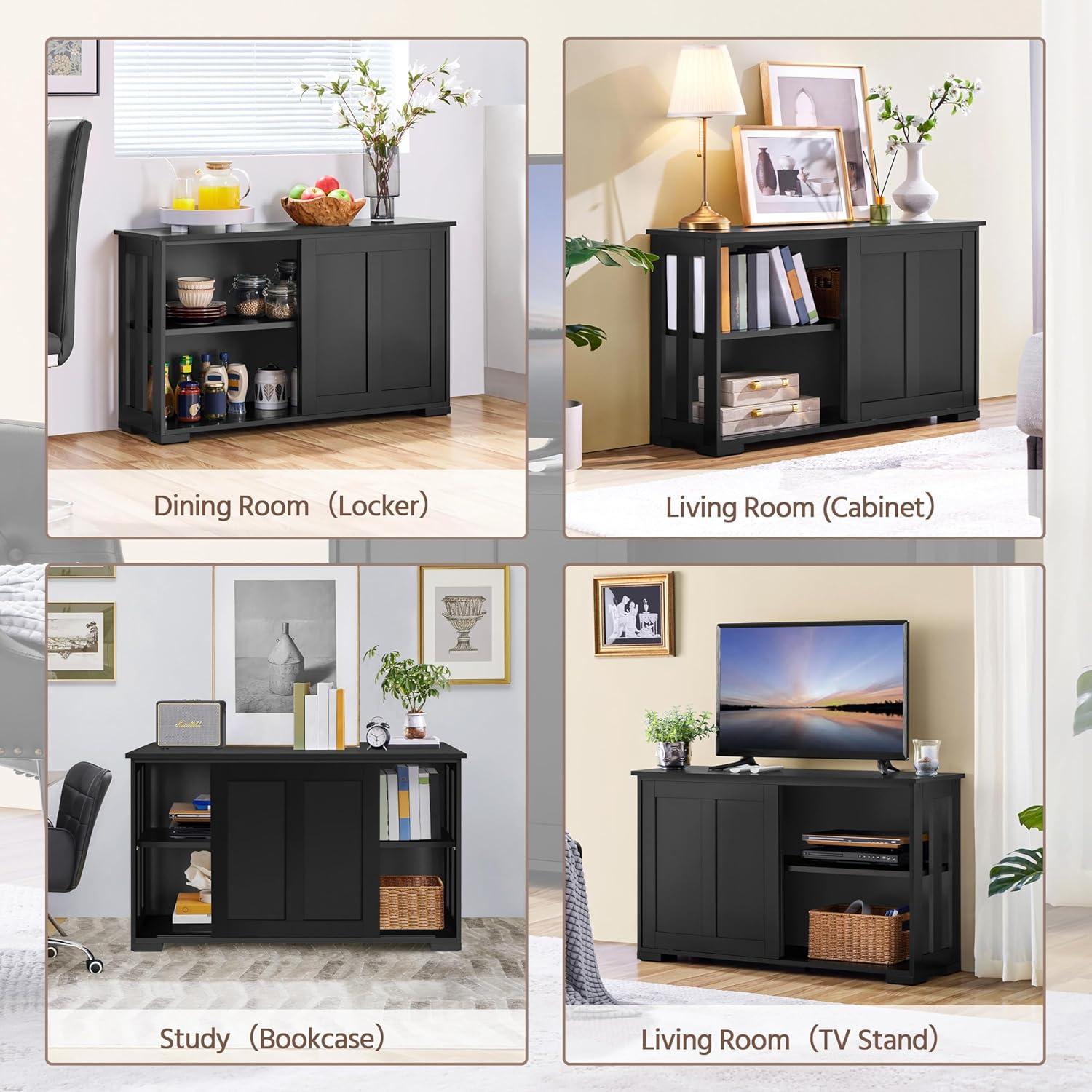 The design aesthetic leans toward minimalism with clean, straight lines that seamlessly blend into various decor styles. Its black finish exudes a sleek, modern vibe, while the sliding door with adjustable shelving allows for customizable storage solutions. The top open area invites creative decoration – whether you choose flower pots,candle holders,or personal collectibles,it adds a subtle but effective charm to the room. This versatile console becomes more than just a TV stand; it’s a stylish sanctuary for media and treasured items alike.