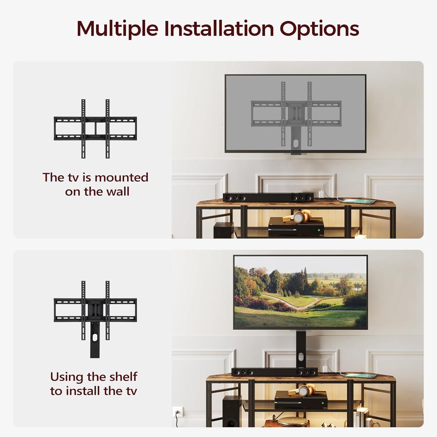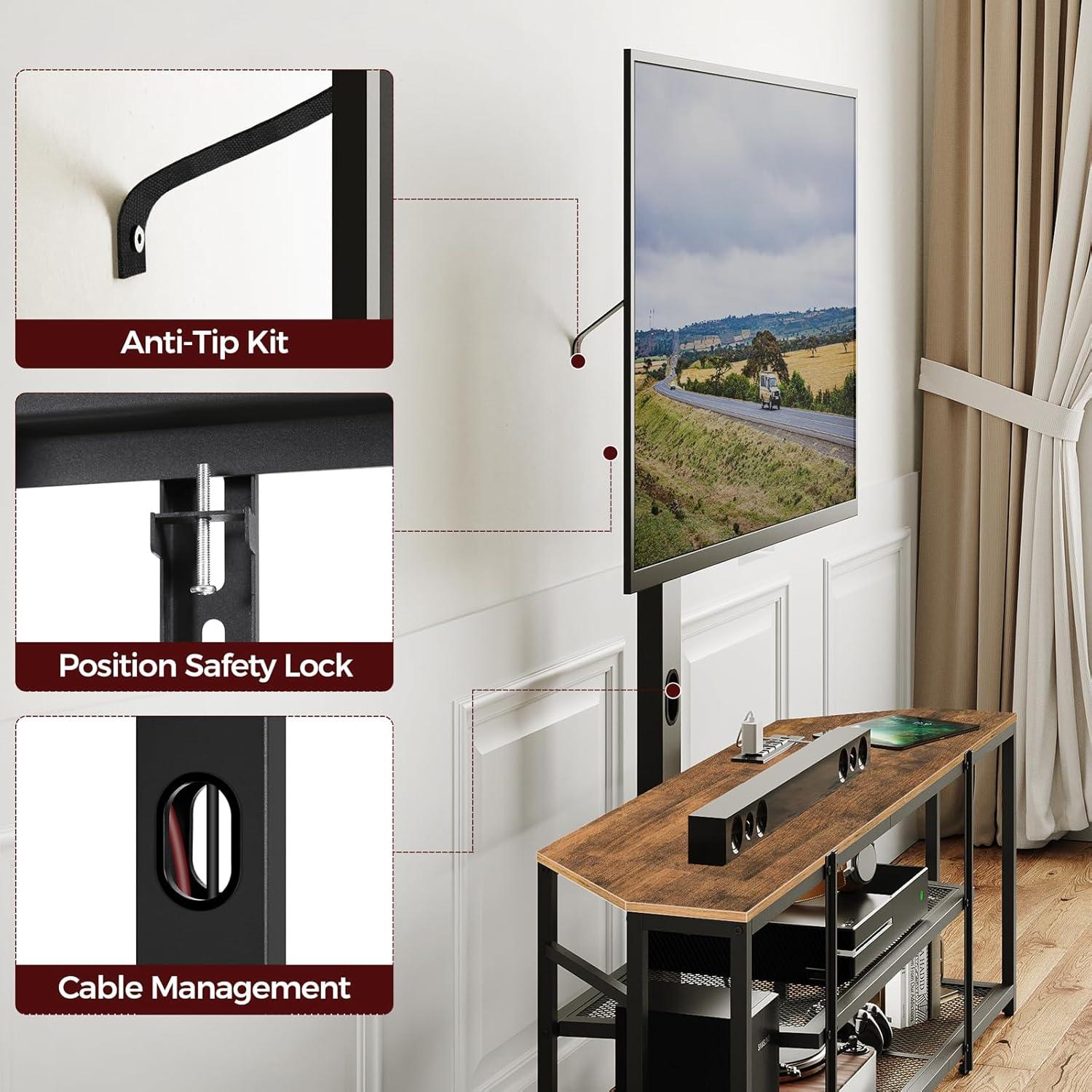 Incorporating this entertainment center into our living area was a seamless experience, thanks to its versatile design and thoughtful features. The adjustable TV mount with a 34° swivel and three height positions allowed us to find the perfect angle for viewing without straining our necks.Its solid side railing not only offers superior stability but also provides peace of mind by preventing items from accidentally falling. The rustic brown and black finish complemented our existing décor, adding a vintage yet modern vibe that truly ties the room together. The corner-friendly shape helped us maximize space that was previously underutilized, turning it into a stylish entertainment hub.