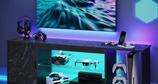 Storage and flexibility are standout features here. With a spacious tabletop, four open cubbies, and two magnetically sealed door cabinets, it’s simple to organize media essentials and keep clutter at bay. The clever incorporation of LED lights with multiple colors and dynamic modes adds a captivating ambiance, perfect for cozy evenings or entertaining guests. Plus, its innovative 4-in-1 adaptability transforms the unit into an L-shaped corner console or even a coffee table, accommodating evolving room layouts with ease.