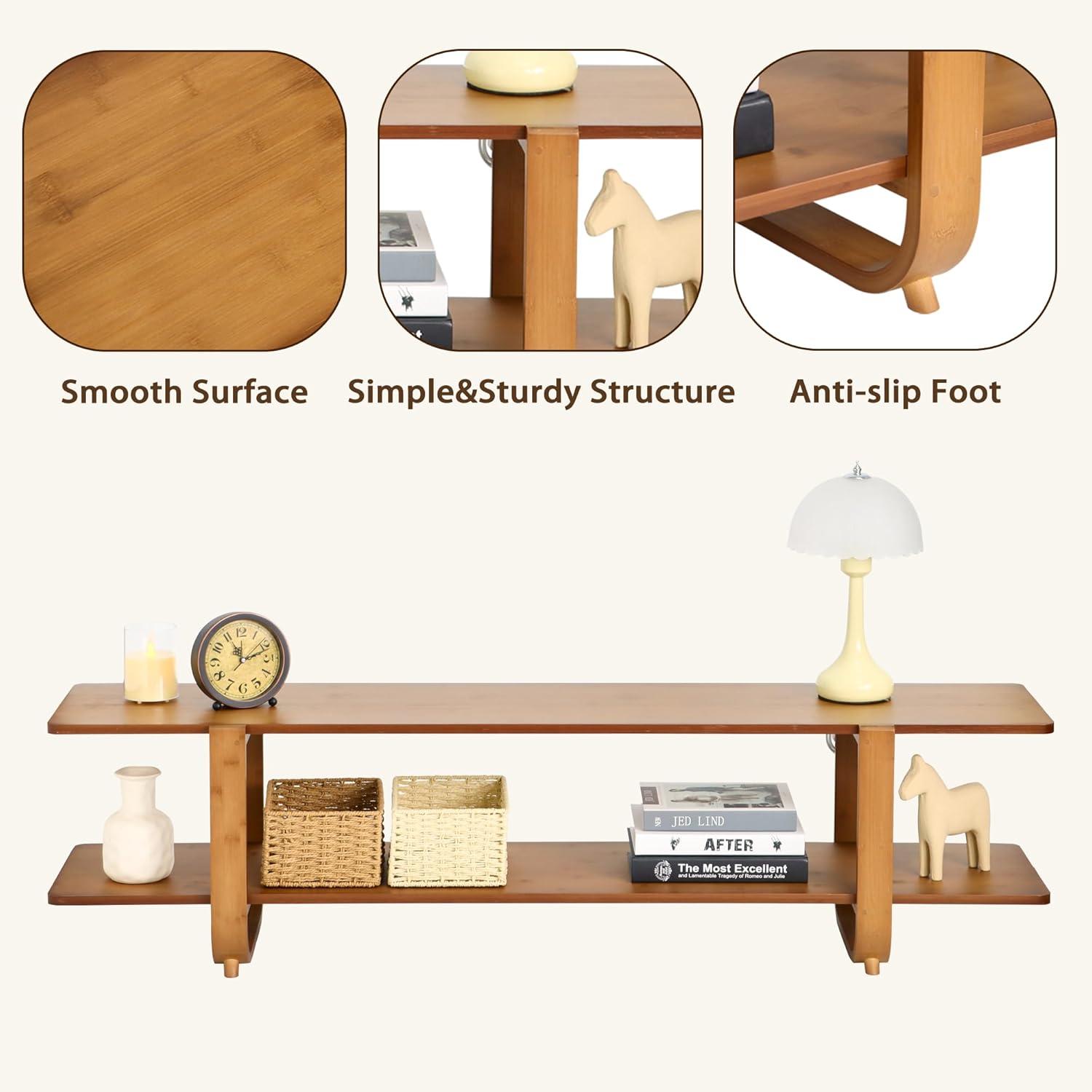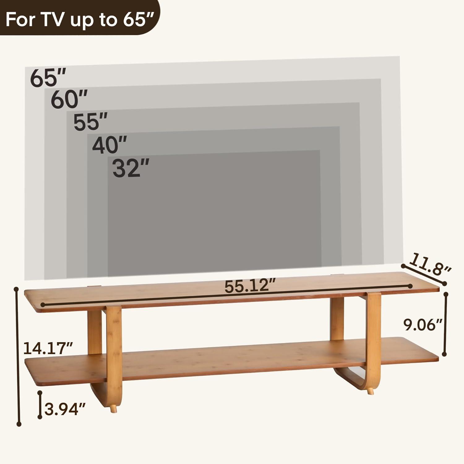 When considering how well this piece fits into various rooms, its versatile size and design truly stand out. At 55 inches in length, it comfortably accommodates TVs up to 65 inches without overwhelming smaller areas, making it a great choice for both cozy bedrooms and spacious living rooms. Its sleek, modern lines combined with the warm walnut bamboo finish add a subtle elegance that complements diverse decor styles. The two-tier open shelving not only provides ample storage but also helps maintain an open,airy feel – ideal for rooms where space conservation is key.