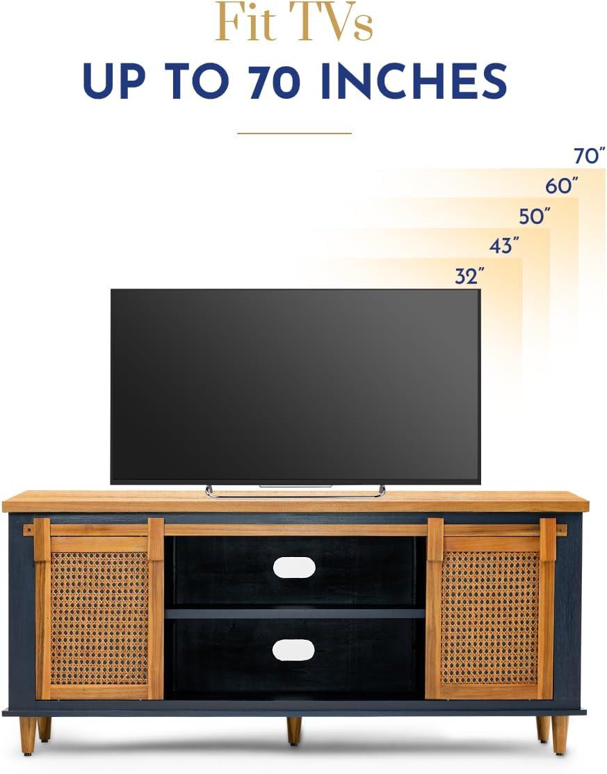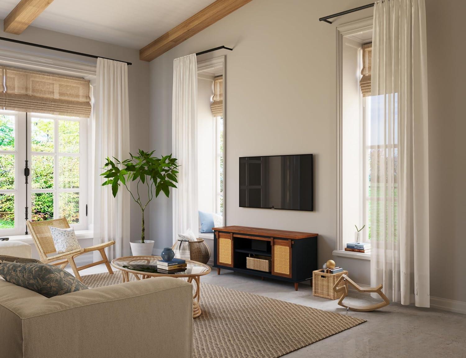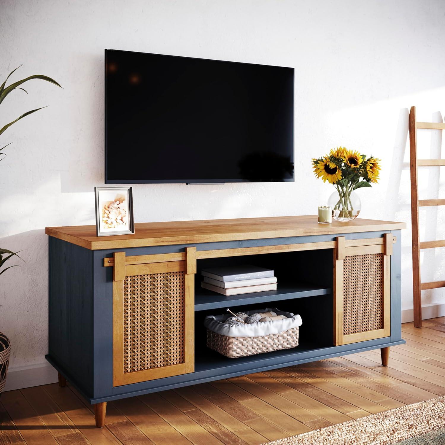 Our experience with this entertainment center highlights its thoughtful design tailored for TVs as large as 70 inches. Crafted with solid wood, the console offers unmatched sturdiness and stability-a crucial factor in supporting a sizable television without any wobble or risk. The ample surface area provides full support beneath the TV, ensuring it sits securely while complementing the overall farmhouse-meets-boho aesthetic effortlessly.The natural rattan sliding doors add an elegant touch while cleverly disguising storage compartments, creating a balanced look that doesn’t overwhelm the room’s visual flow.