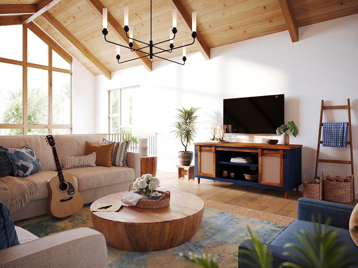 The combination of solid wood and natural rattan sliding doors introduces a beautifully balanced aesthetic, perfectly suited for those seeking to merge modern farmhouse warmth with boho serenity. The navy and caramel accents subtly infuse the space with calming hues, enhancing the overall ambiance with an inviting, cozy touch. Whether placed in the living room or bedroom, its versatile design harmonizes effortlessly with a variety of décor styles, elevating the environment while creating a relaxed yet stylish centerpiece. The smooth sliding doors not only add a tactile, interactive element but also help conceal clutter, maintaining a clean and peaceful visual flow.