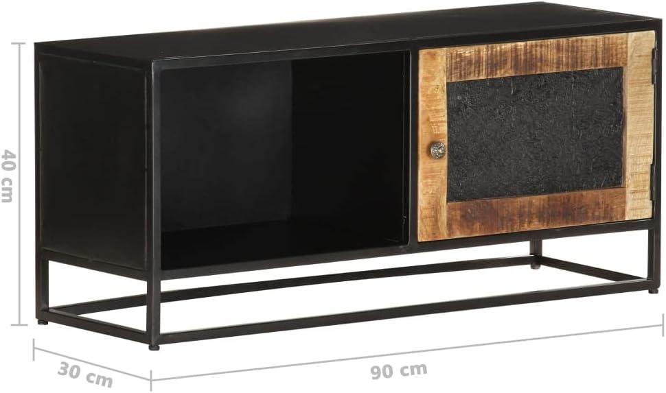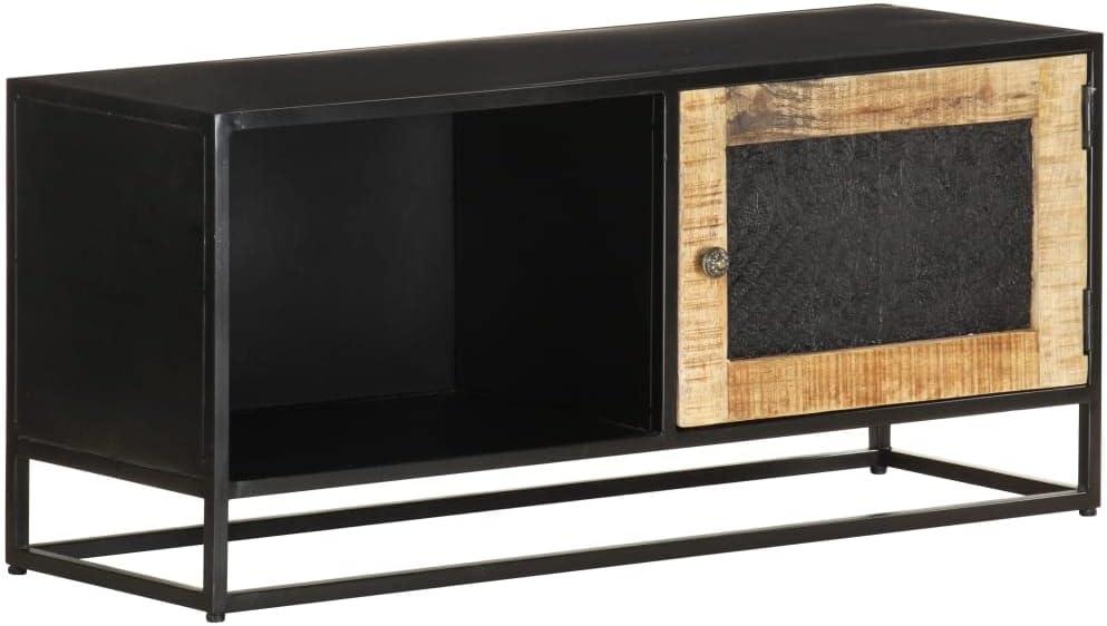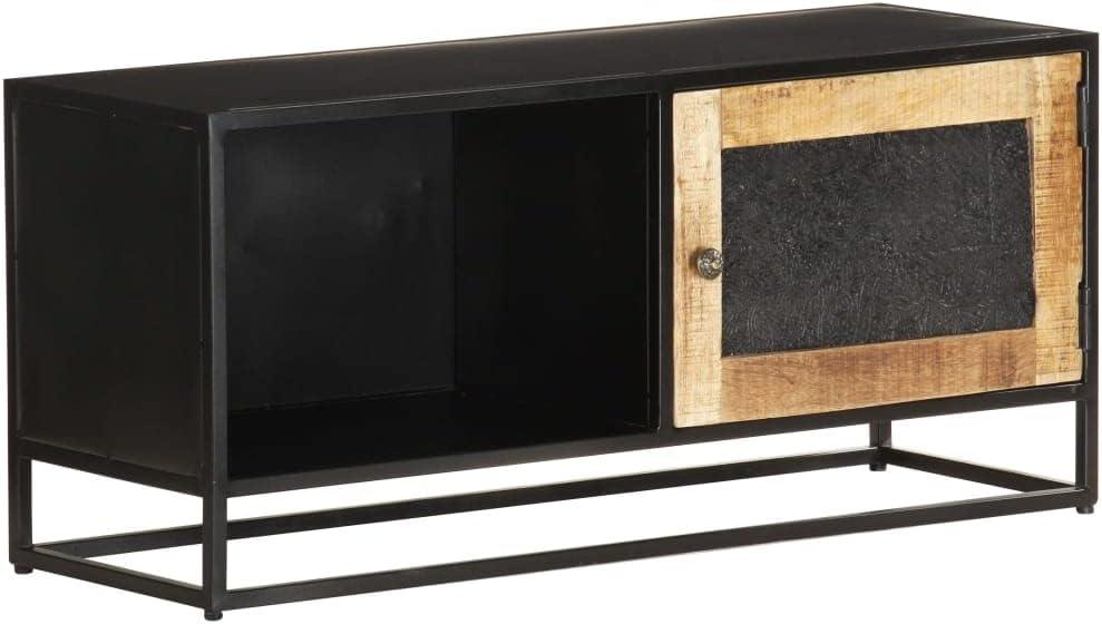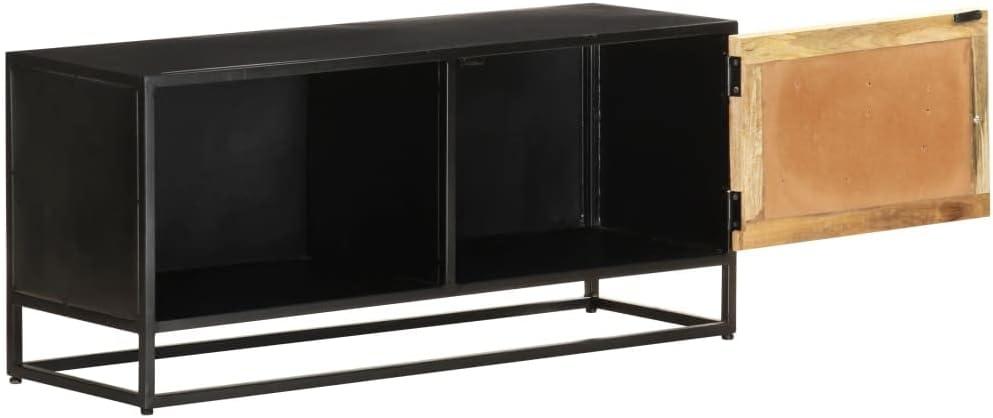the dimensions make it a reliable solution whether you’re aiming for a sleek media setup or additional storage in compact living environments. Its unique mango wood grains and black powder-coated iron frame balance style with size sensibility, ensuring it fits seamlessly while adding an industrial charm.