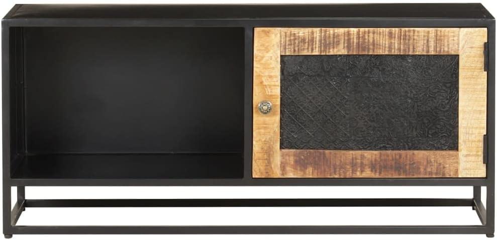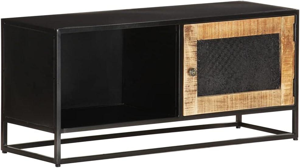 When evaluating the practicality of this piece, we find its thoughtful design truly stands out. Constructed from rough mango wood,the sturdy top surface not only supports a television but also serves as a stylish platform for decorative items like photo frames,plants,and vases. The powder-coated iron frame provides additional stability, ensuring it withstands everyday use in busy living spaces.A hand-carved door adds a touch of artisanal charm while concealing a generous compartment. This hidden space is perfect for organizing media accessories, games, or even books, keeping our rooms neat and clutter-free.