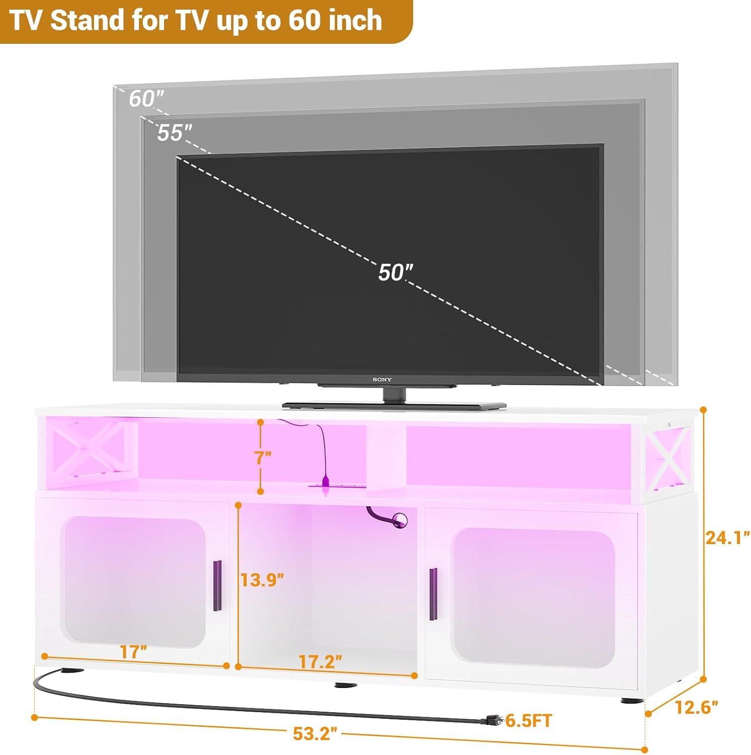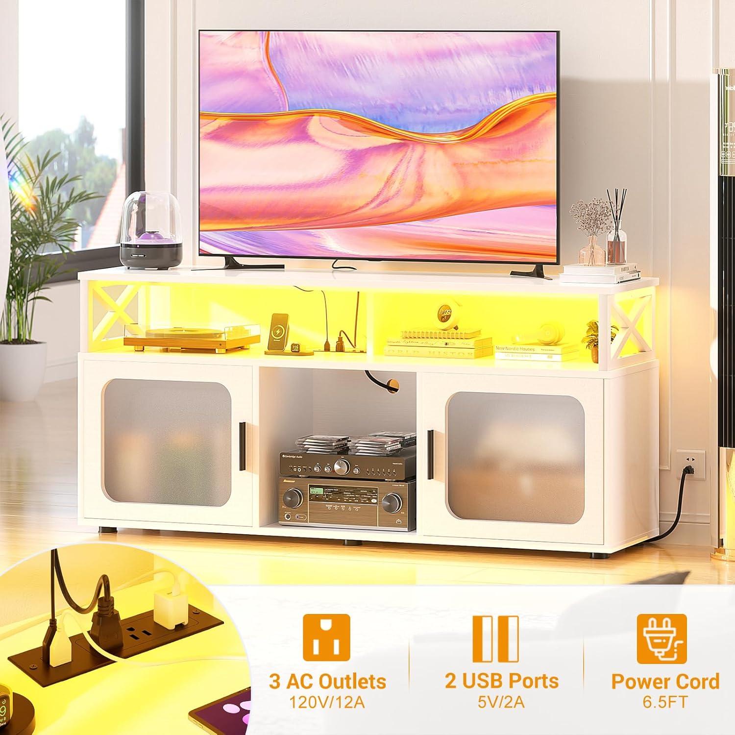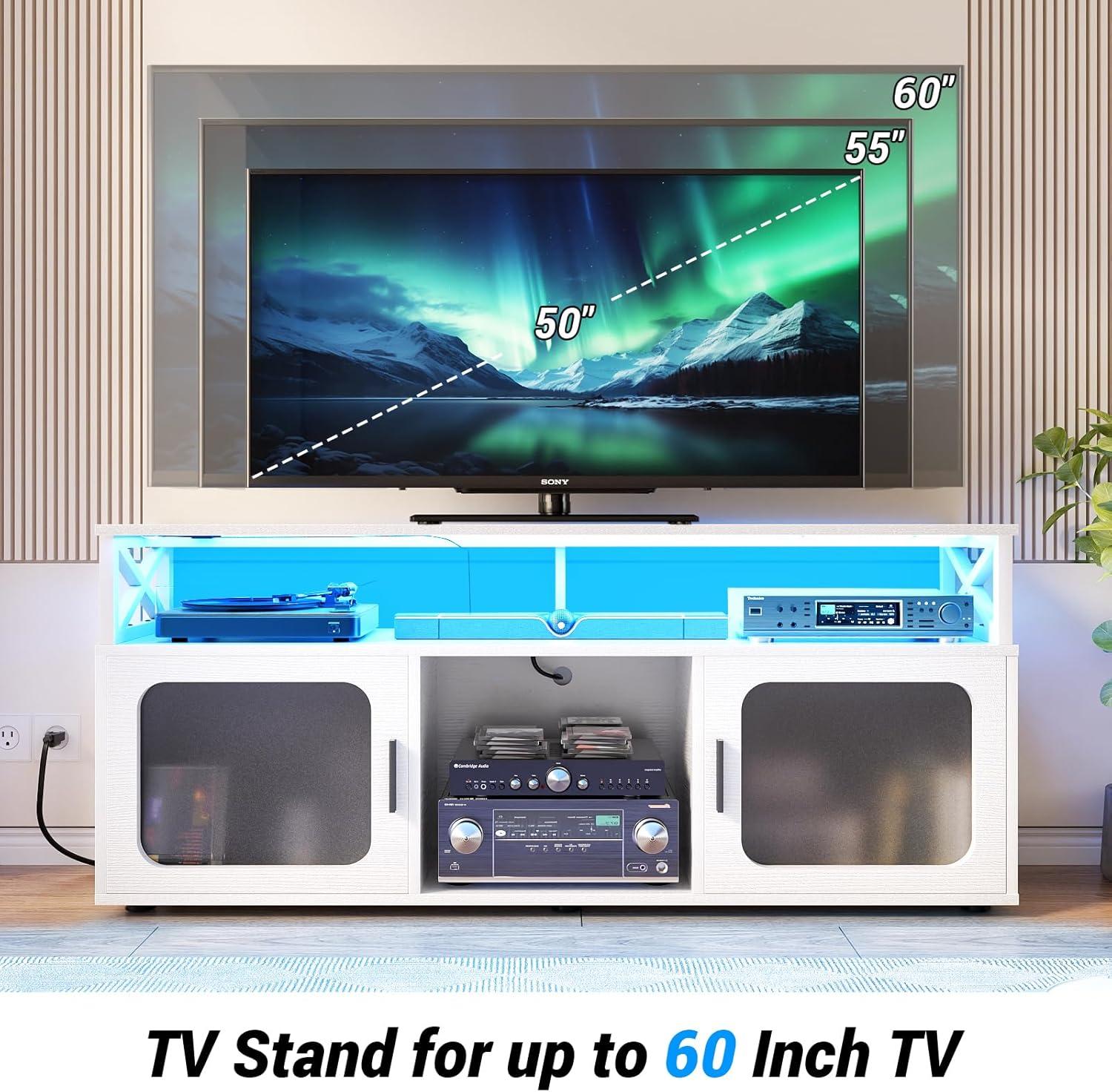 the stand impresses with a sleek, modern design that effortlessly blends customary functionality with contemporary aesthetics. Its crisp white finish combined with frosted acrylic doors brings a clean, organized look to any living room or bedroom setup.The elegant X-shaped side panels not only add a distinct visual flair but also enhance the overall sturdiness of the structure. Built to accommodate televisions up to 60 inches, the compact size suits smaller spaces without overwhelming the room. Additionally, the integrated LED strip lights, offering over 60,000 customizable colors and dynamic modes, provide a captivating ambiance that can sync with your music or be set on a timer-perfect for creating a personalized home theater vibe.