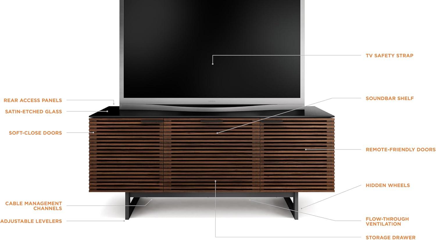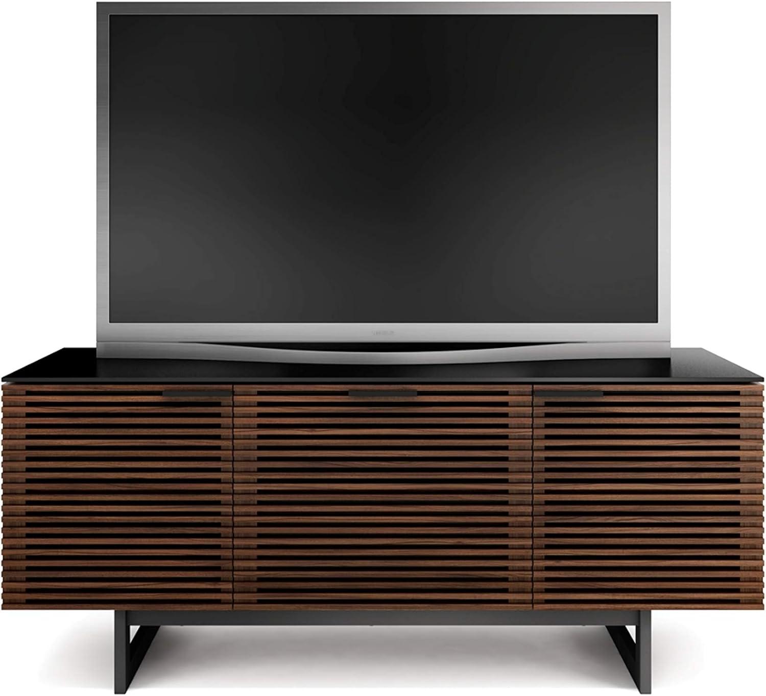 Our experience with this TV stand reveals a perfect blend of form and function that suits contemporary homes seamlessly. The sleek chocolate-stained walnut finish paired with the satin-etched glass top adds an elegant touch without overpowering the room. Its thoughtful design incorporates remote-friendly hardwood louvered doors that conceal electronics while allowing infrared signals to pass through,so we don’t compromise on accessibility or aesthetics. The full-width soundbar shelf paired with a unique, pull-out media storage drawer keeps our entertainment essentials organized and within reach, decluttering our living space effectively.