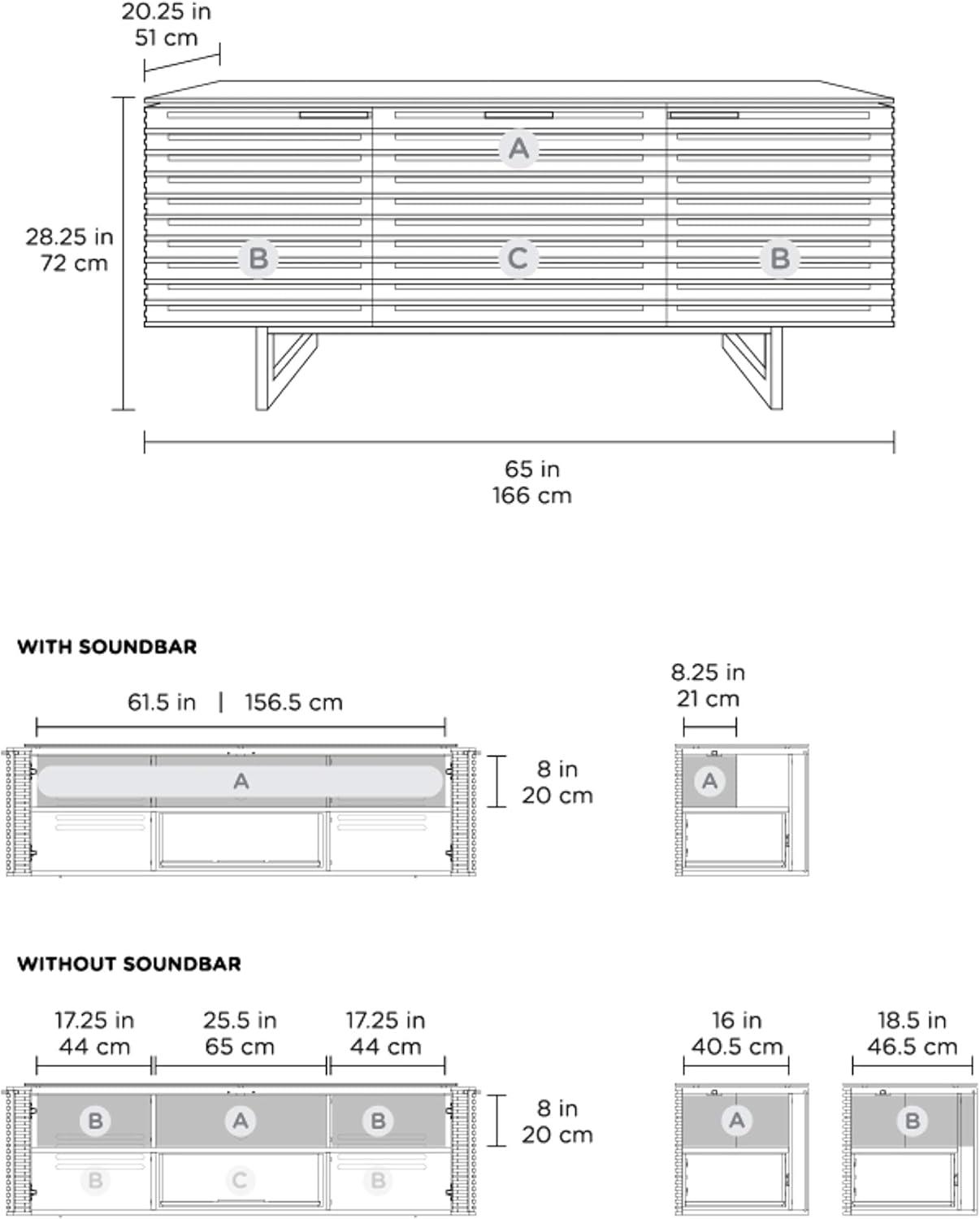 | Full-width soundbar shelf perfectly accommodates soundbars without cramping space | Limited color options mainly focus on the chocolate stained walnut, potentially clashing with lighter decor |