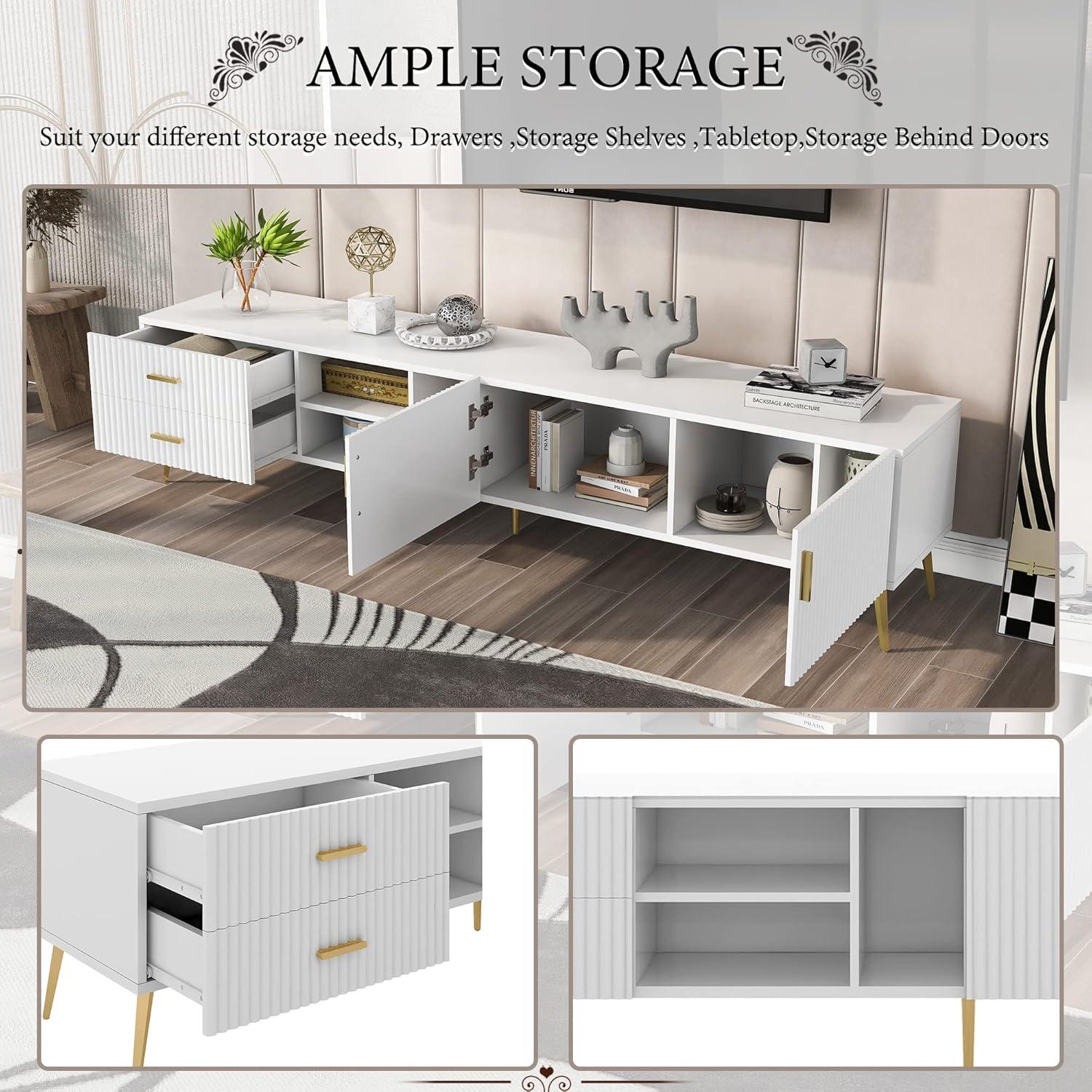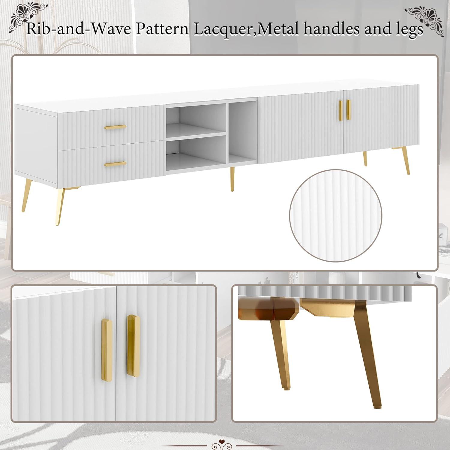 We were promptly drawn to the clean, contemporary lines of this modern console, which make it a perfect centerpiece for any living room or bedroom setup. The sleek white finish paired with five distinctive champagne legs creates a subtle contrast that adds a refined touch without overwhelming the space. The wavy door panels also introduce a unique visual rhythm, making this piece stand out while maintaining a minimalist vibe. Its low-profile silhouette ensures that even large 75-inch TVs can be accommodated gracefully, blending function and style seamlessly.