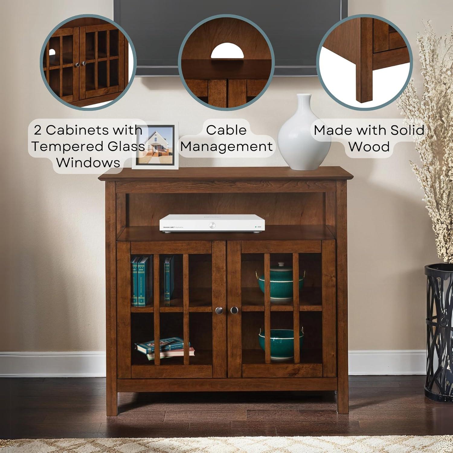 Combining solid wood craftsmanship with a sleek, modern-traditional design, this entertainment center is a versatile addition that balances form and function beautifully. Its thoughtfully designed shelving and cabinet space allow us to neatly organize our media essentials, from gaming consoles to cable boxes, while the tempered glass doors add a touch of elegance. With built-in cable management,it keeps the area tidy and clutter-free-perfect for those who appreciate both style and practicality in their living spaces. The compact dimensions make it well-suited for apartments, condos, or rooms that require a smart use of space without sacrificing storage.