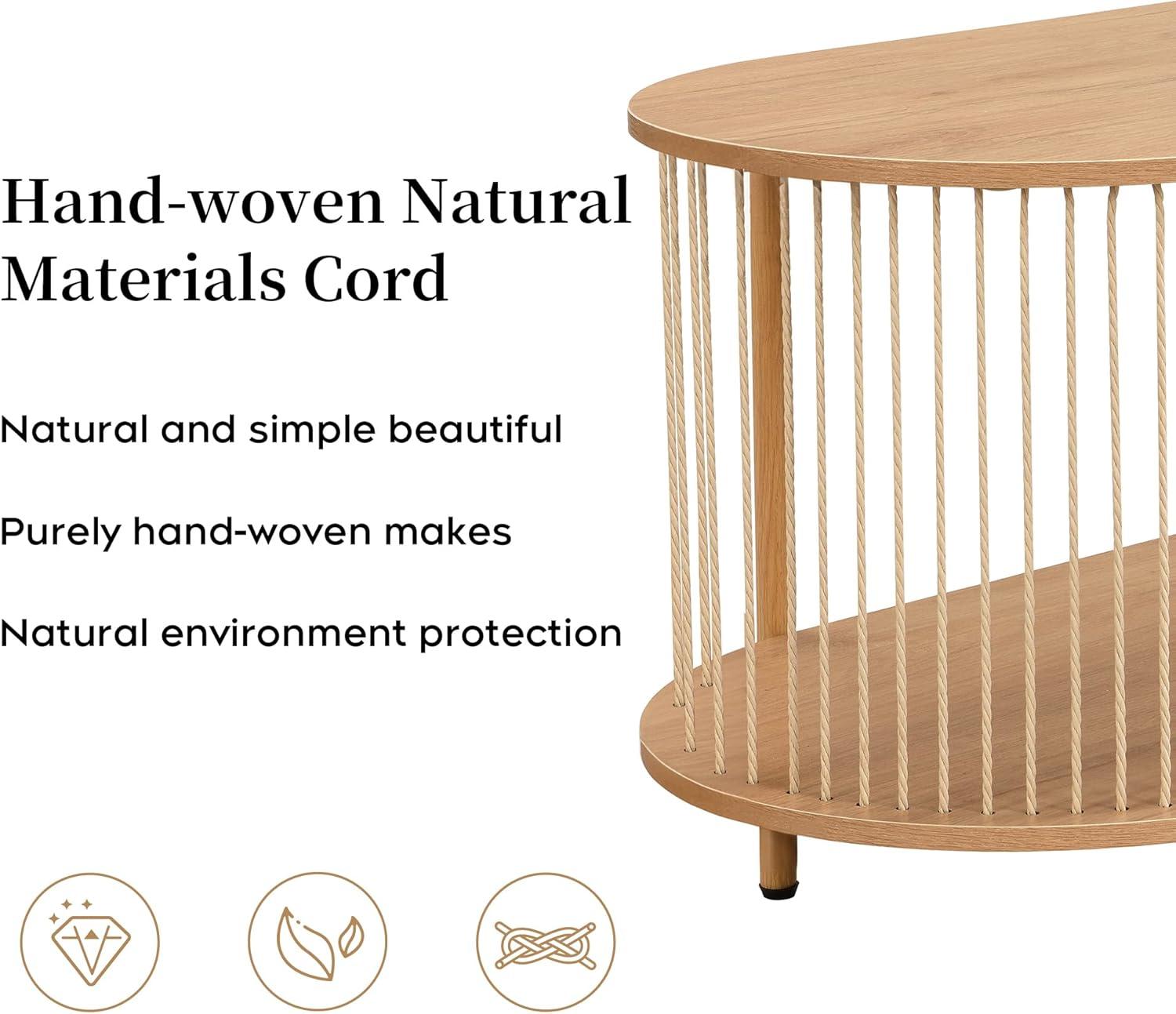 Blending mid-century modern aesthetics with natural, bohemian elements, this TV console stands out as a stylish yet practical addition to any living room. The hand-woven ropes crafted from natural plant paper fiber infuse warmth and texture,making the console feel organic and inviting. Its oval shape contours smoothly, softening the room’s edges while maintaining a striking presence. Supported by sturdy, powder-coated steel legs, this entertainment center offers durability without sacrificing elegance. Additionally, the MDF wood surface is both environmentally friendly and built to last, giving us confidence in the long-term quality of this piece.