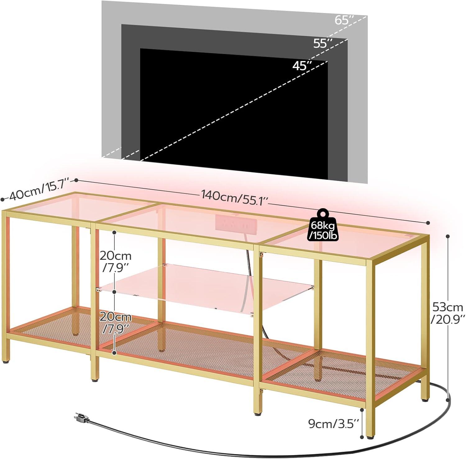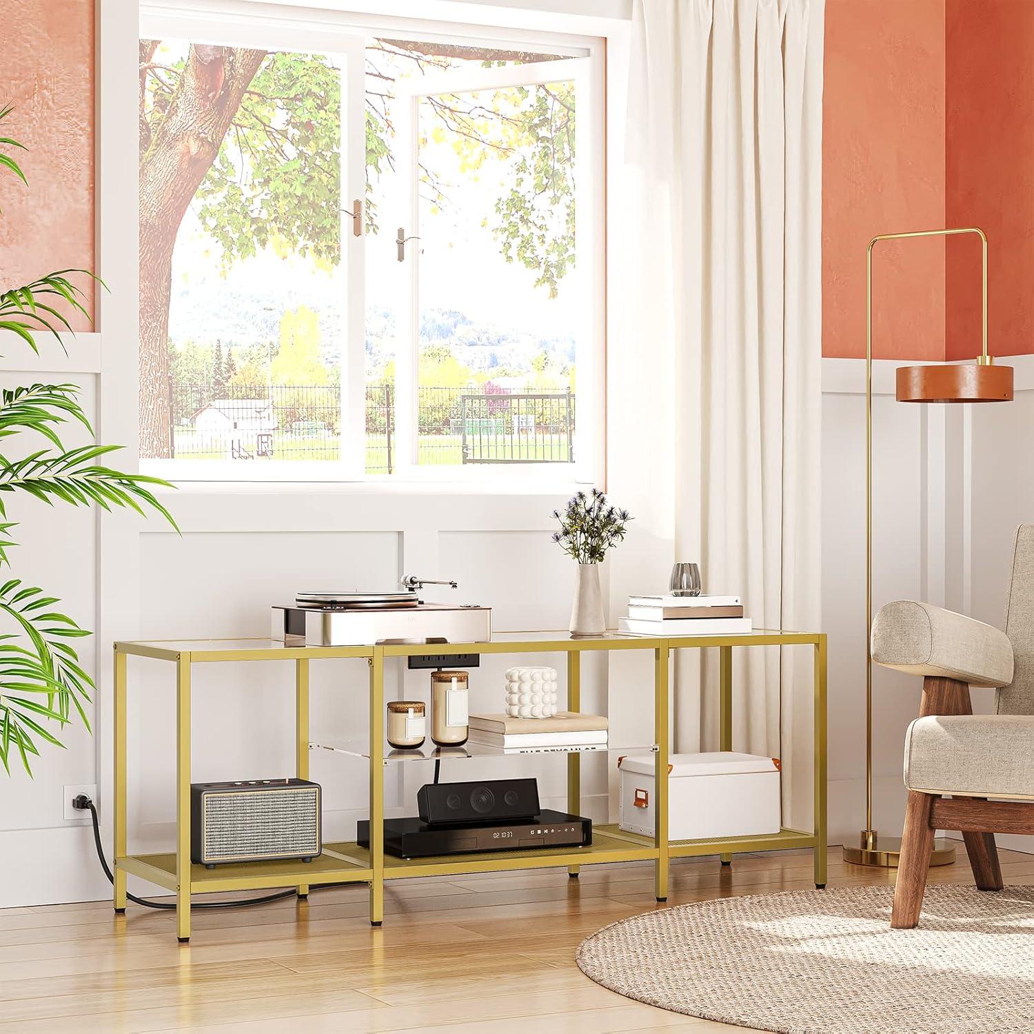 In sum, the HOOBRO Gold TV Stand with LED Lights and Power Ports combines style, functionality, and convenience into one modern entertainment centerpiece. Its elegant gold frame paired with tempered glass gives any living room a sleek touch, while the adjustable LED lighting lets you set the perfect mood. The integrated power strip with USB ports keeps your devices charged and organized without extra clutter. Plus, with three open shelves and sturdy metal construction, it offers ample space and reliable support for your media setup.