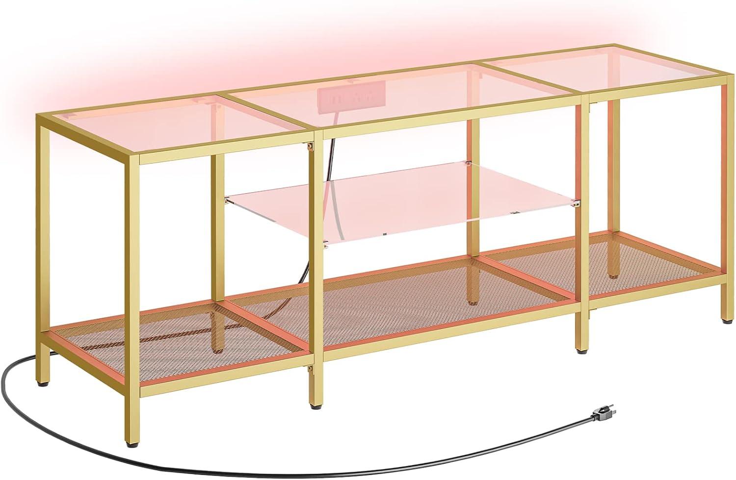 After spending time with this sleek unit, we appreciate how it blends form and function effortlessly.The golden metal frame paired with tempered glass gives it a modern touch that elevates any living space without overpowering it. The 16-color adjustable LED strip adds a customizable ambiance, perfect for movie nights or casual lounging. Its sturdy construction, enhanced by eight adjustable leg levelers, ensures stability even on uneven floors, while the three open shelves provide ample room to showcase your favorite décor or media devices.Plus, the integrated power strip with USB ports simplifies charging multiple gadgets, reducing clutter and keeping everything within easy reach.