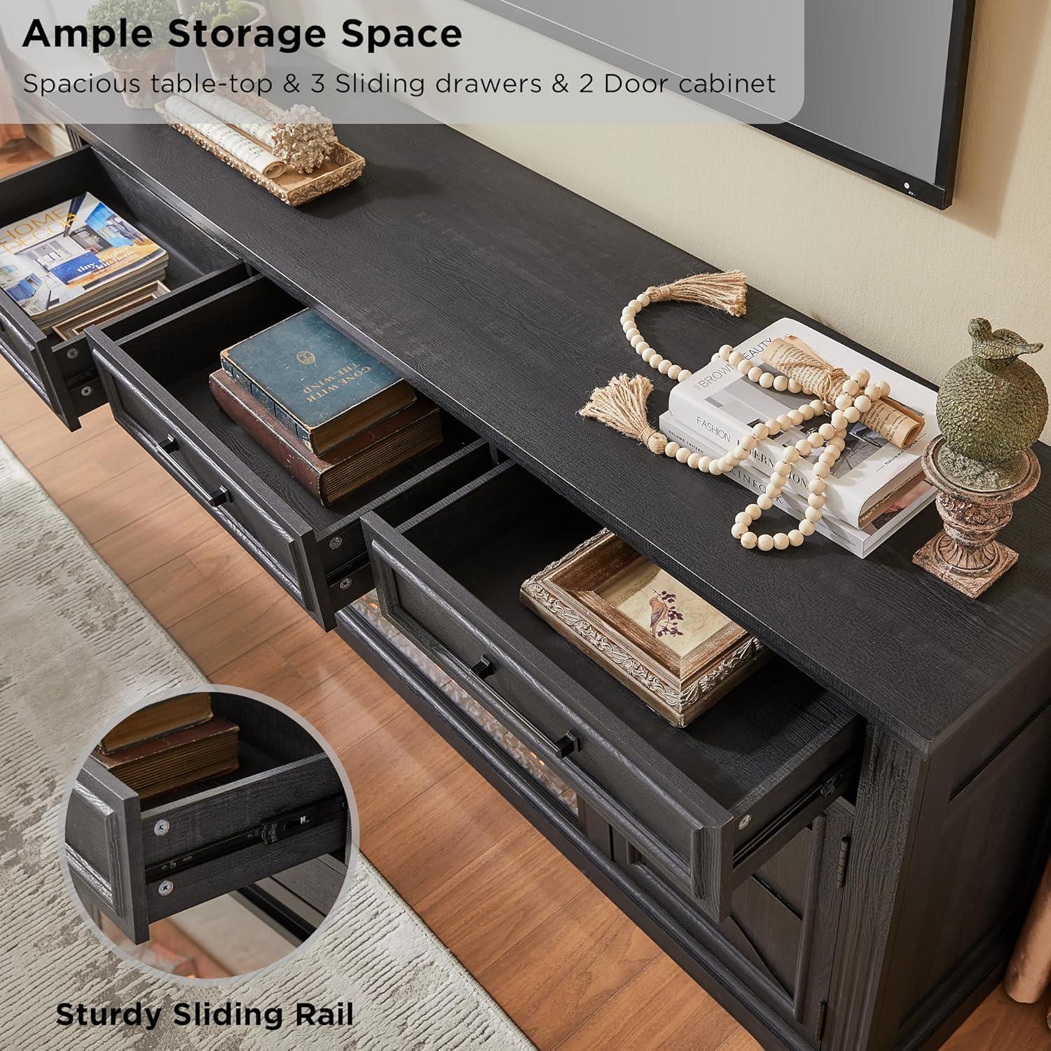 Along with its TV capacity,the stand offers a wealth of storage options that keep your entertainment area tidy. With two large cabinets and three roomy drawers, it can store media players, remotes, and various peripherals while maintaining clean lines and minimal clutter. The integrated 30-inch electric fireplace sits centrally below the TV space, maintaining a perfect balance between aesthetics and function. It’s also compatible with remote controls for customizable heat and flame settings, making this setup ideal for those who want warmth and ambiance alongside their large screen.See how well it fits your living room setup below: