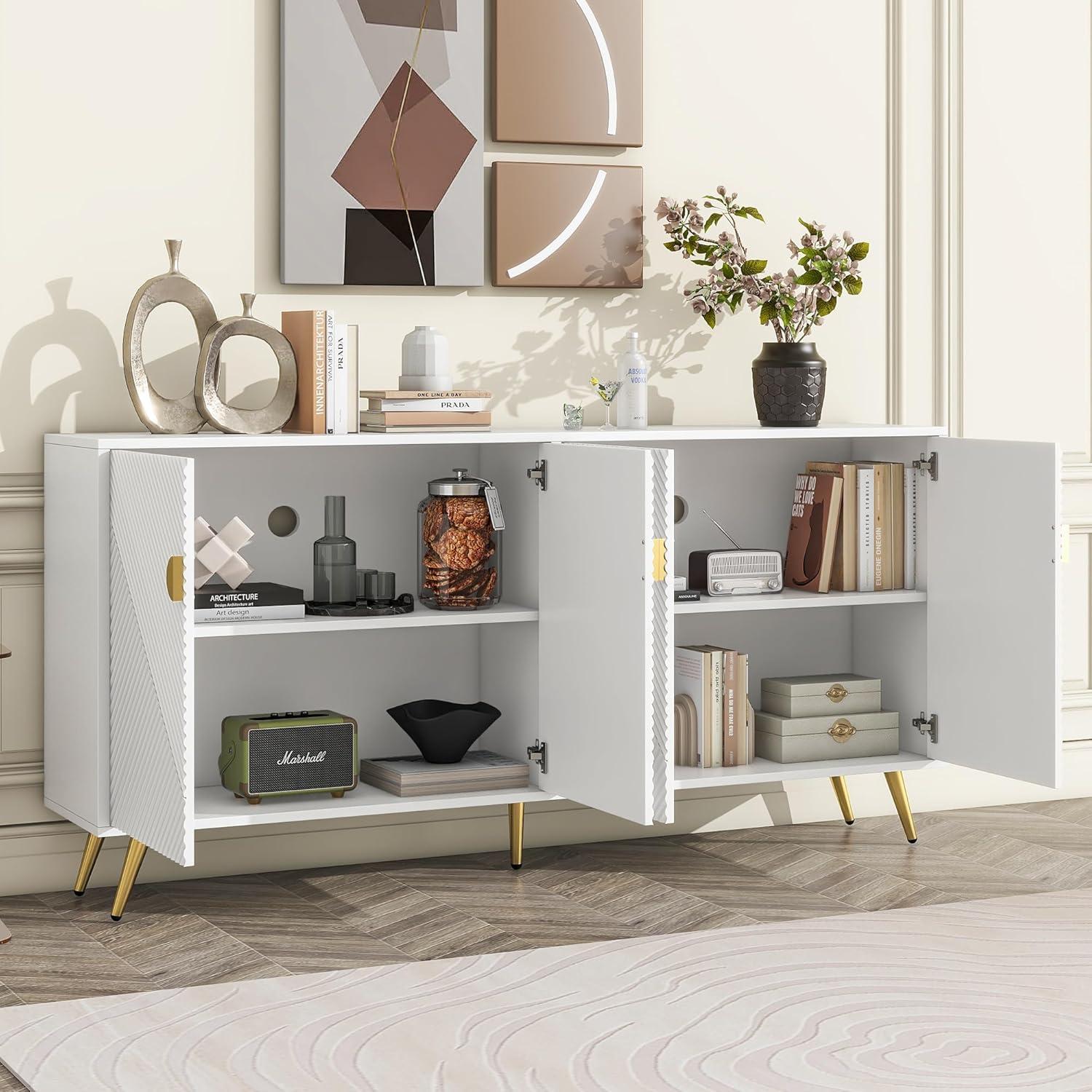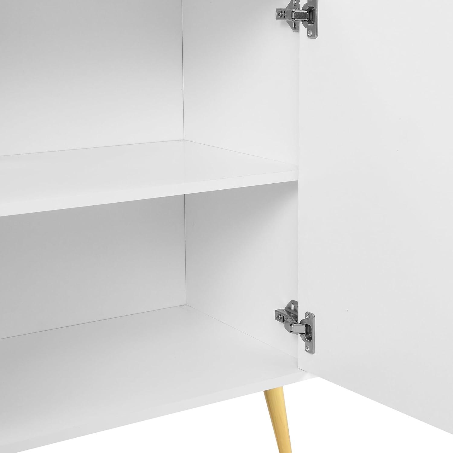 The fluid lines gracefully inset on the cabinet doors create a seamless visual flow that complements various interior styles, from modern minimalist to cozy contemporary. The smooth white finish brightens up any living space, making the unit not only functional but also a statement piece. Adding to its refined appearance, the metal handles and legs introduce subtle yet striking metallic accents that enhance the overall sophistication without overwhelming the design.