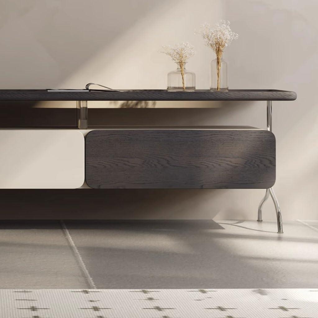 This TV stand strikes the ideal balance between functionality and style, boasting a high-end solid wood construction paired with thickened iron support that ensures both durability and elegance.Its clean, modern lines and subtle retro industrial vibe allow it to seamlessly complement diverse décor styles, from minimalist lounges to cozy living rooms and bedrooms. The thoughtful inclusion of three silent-gliding storage drawers means you can keep essentials organized and out of sight, while the protective anti-collision rounded edges add a layer of safety – especially for families or homes with pets and children.