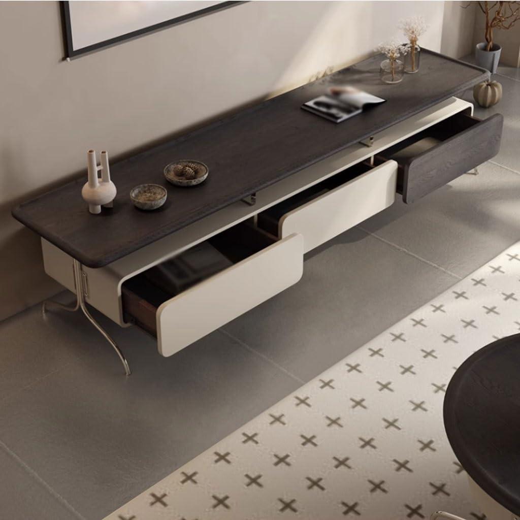 This TV stand strikes the ideal balance between functionality and style, boasting a high-end solid wood construction paired with thickened iron support that ensures both durability and elegance.Its clean, modern lines and subtle retro industrial vibe allow it to seamlessly complement diverse décor styles, from minimalist lounges to cozy living rooms and bedrooms. The thoughtful inclusion of three silent-gliding storage drawers means you can keep essentials organized and out of sight, while the protective anti-collision rounded edges add a layer of safety – especially for families or homes with pets and children.