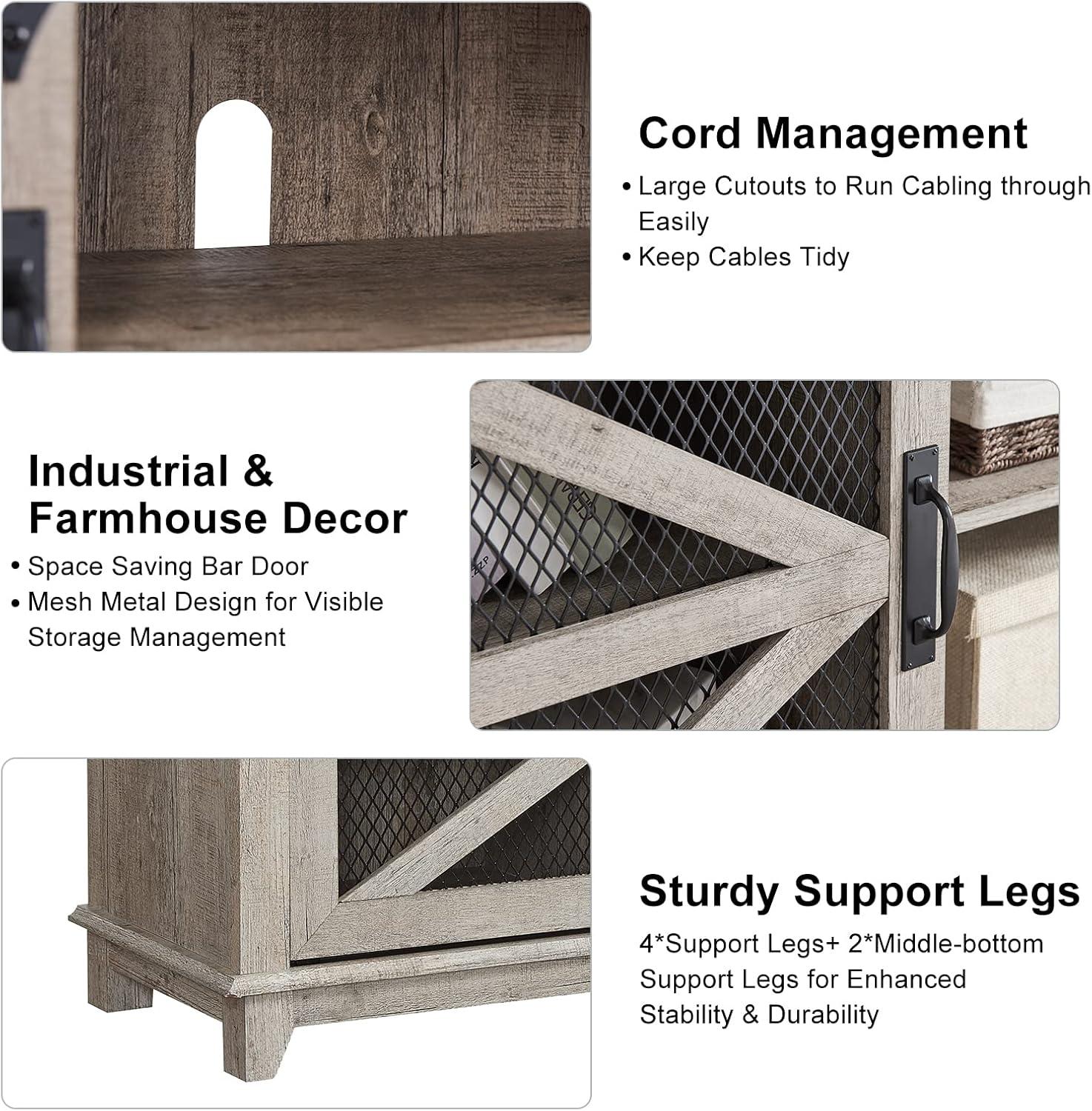 The sliding barn doors on this entertainment center are a highlight of its design,combining rustic charm with practical functionality. Gliding smoothly along their tracks, the doors offer effortless access to the spacious cabinets, allowing us to quickly retrieve media equipment or decorative items. The ability to position the doors on either side adds a level of customization that adapts well to different room layouts,ensuring a clean,clutter-free appearance. The inset metal mesh detail and dark iron hardware not onyl enhance the industrial farmhouse aesthetic but also provide sturdy, reliable hardware that feels solid with each slide.