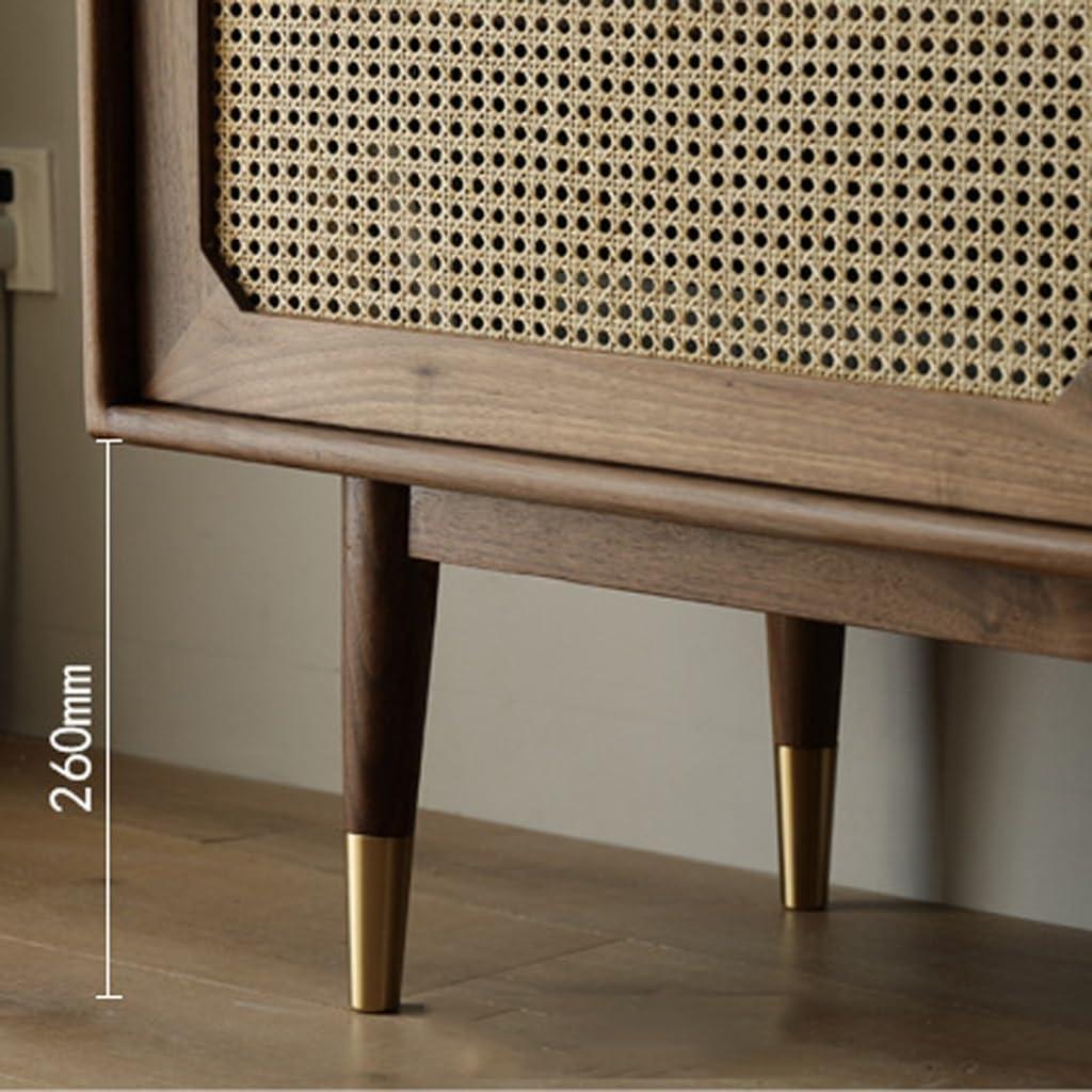 We found this piece to be a beautiful blend of modern sophistication and traditional charm,thanks to its solid wood construction paired with striking rattan sliding doors. The rich wood grain panels enhance the retro aesthetic, making it a versatile addition that complements various decor styles effortlessly. Its surface finish is smooth with elegant edge polishing, contributing to a timeless quality that resists moisture and deformation even after extended use.