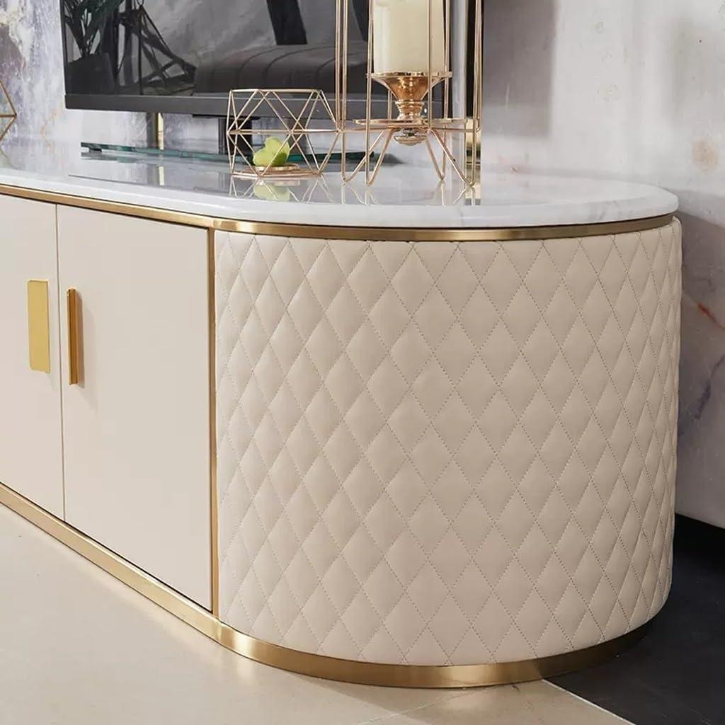 The slate marble countertop is truly the focal point that elevates this piece beyond a typical entertainment center.Its natural veining and subtle tonal variations bring a complex texture and depth to the overall design, creating an elegant contrast against the leather and wood materials. This countertop not only adds a touch of luxury but also serves as a durable surface that’s perfect for placing decorative accents, family photos, or even your favorite coffee table books. The natural stone gives the unit an artisanal vibe that complements both modern and classic interiors,making the living space feel more refined and curated.