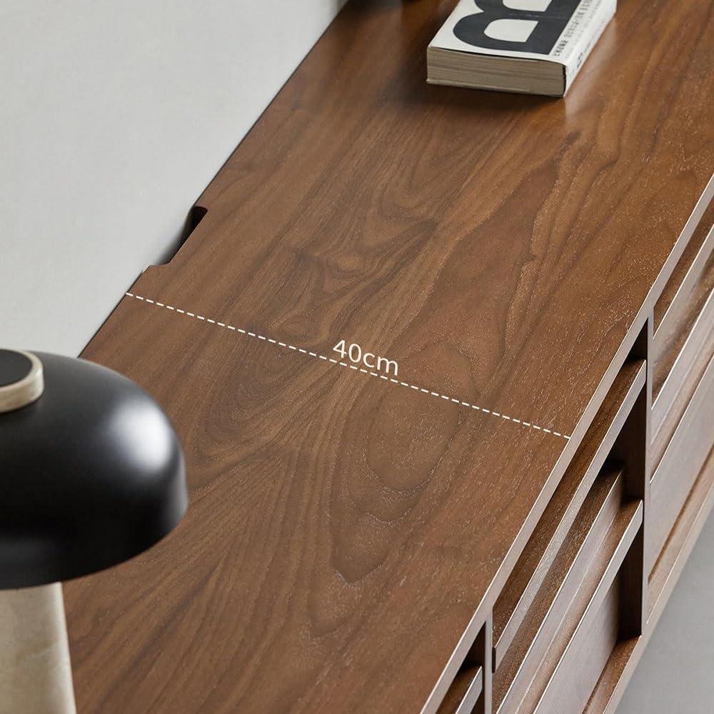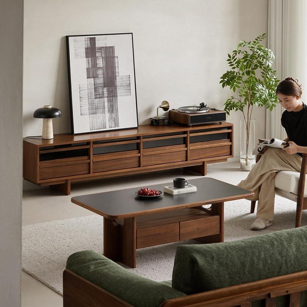 We appreciate how this entertainment center perfectly blends a modern aesthetic with rustic farmhouse charm, making it versatile enough for a variety of environments-from cozy living rooms to professional conference rooms and stylish hotel lobbies. Its solid walnut construction ensures durability, while the transparent European gray glass doors bring a refreshing lightness that balances the darker wood tones. the thoughtful layout featuring four spacious drawers alongside open storage areas provides practical organization for electronic devices, DVDs, books, and decorative items, maintaining a clutter-free, elegant appearance.