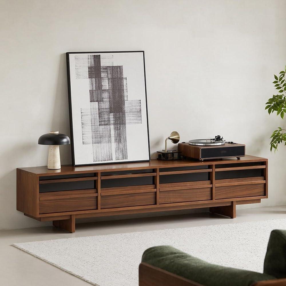 We appreciate how this solid wood entertainment center offers a smart balance of style and practical storage options, making it ideal for small households. Its four drawers allow us to neatly categorize and store various items such as DVDs, routers, audio equipment, and books, eliminating clutter while keeping essentials within easy reach. The cabinet door, crafted with delicate European gray glass, adds a touch of lightness and clarity that contrasts beautifully with the rich walnut wood, preventing the piece from feeling heavy or bulky in limited spaces.